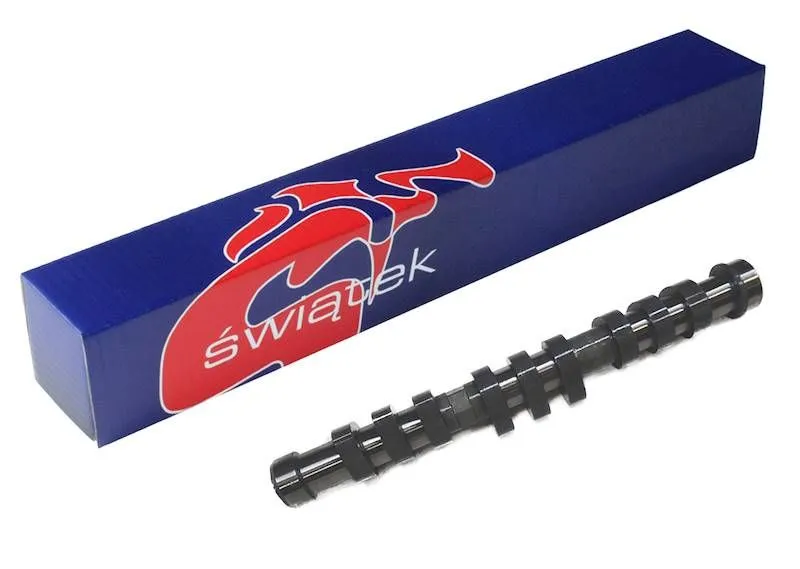 Tuningowy wałek rozrządu dolotowy Świątek Audi 2.7 V6 30v 4-6 Stage GT/R Krzywa dolotowa (seria) Kąt alfa / ustawienie krzywek Luzy zaworowe Wznios Czas otwarcia 119 (seria 115) hydr. Całk. 1.0 mm 2,0 mm 8,8mm 264° 221° 200° Krzywa wylotowa (seria) Wznios Czas otwarcia Całk. 1.0 mm 2,0 mm - - - - Wałki rozrządu zmieniają charakterystykę pracy silnika – poprawiają przebieg mocy i momentu obrotowego silnika. Wśród wałków sportowych produkowanych w firmie Świątek rozróżniamy typy: W zależności od typu wałka, konieczne są dodatkowe modyfikacje w celu uzyskania prawidłowej pracy GT – wałki przeznaczone do codziennej eksploatacji samochodu. Zalecane jest wykonanie strojenia silnika na hamowni (chip-tuning). Przyrost mocy i momentu około 10%. GT/R – mocniejsze wałki GT. Konieczne strojenie silnika na hamowni. Przyrost mocy i momentu około 10-20%. R – wałki rajdowe, nastawione na wyższą moc i moment w większym zakresie obrotów. sportowe przełożenia skrzyni biegów itp.) i strojenie silnika na hamowni W – wałki wyścigowe, poprawiają maksymalnie moc i moment. Przeróbki podobne jak dla wałków rajdowych. Osiągi mocy powyżej 100 KM z 1000 cm3 silnika.