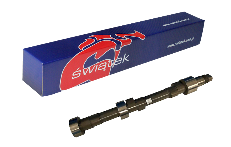 Tuningowy wałek rozrządu lewy Świątek Porsche 2.2/2.4/2.7 12v Stage GT/R Krzywa dolotowa (seria) Kąt alfa / ustawienie krzywek Luzy zaworowe Wznios Czas otwarcia - Seryjne Całk. 1.0 mm 2,0 mm 7.65mm 290° - 231° Krzywa wylotowa (seria) Wznios Czas otwarcia Całk. 1.0 mm 2,0 mm 7,35mm 282° - 227° Wałki rozrządu zmieniają charakterystykę pracy silnika – poprawiają przebieg mocy i momentu obrotowego silnika. Wśród wałków sportowych produkowanych w firmie Świątek rozróżniamy typy: W zależności od typu wałka, konieczne są dodatkowe modyfikacje w celu uzyskania prawidłowej pracy GT – wałki przeznaczone do codziennej eksploatacji samochodu. Zalecane jest wykonanie strojenia silnika na hamowni (chip-tuning). Przyrost mocy i momentu około 10%. GT/R – mocniejsze wałki GT. Konieczne strojenie silnika na hamowni. Przyrost mocy i momentu około 10-20%. R – wałki rajdowe, nastawione na wyższą moc i moment w większym zakresie obrotów. sportowe przełożenia skrzyni biegów itp.) i strojenie silnika na hamowni W – wałki wyścigowe, poprawiają maksymalnie moc i moment. Przeróbki podobne jak dla wałków rajdowych. Osiągi mocy powyżej 100 KM z 1000 cm3 silnika.