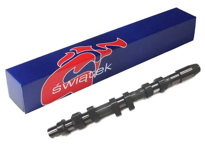 Tuningowy wałek rozrządu wylotowy Świątek Audi 2.7 V6 30v 1-3 Stage GT/R Krzywa dolotowa (seria) Kąt alfa / ustawienie krzywek Luzy zaworowe Wznios Czas otwarcia 119 (seria 115) hydr. Całk. 1.0 mm 2,0 mm - - - - Krzywa wylotowa (seria) Wznios Czas otwarcia Całk. 1.0 mm 2,0 mm 10mm 264° 227° 210° Wałki rozrządu zmieniają charakterystykę pracy silnika – poprawiają przebieg mocy i momentu obrotowego silnika. Wśród wałków sportowych produkowanych w firmie Świątek rozróżniamy typy: W zależności od typu wałka, konieczne są dodatkowe modyfikacje w celu uzyskania prawidłowej pracy GT – wałki przeznaczone do codziennej eksploatacji samochodu. Zalecane jest wykonanie strojenia silnika na hamowni (chip-tuning). Przyrost mocy i momentu około 10%. GT/R – mocniejsze wałki GT. Konieczne strojenie silnika na hamowni. Przyrost mocy i momentu około 10-20%. R – wałki rajdowe, nastawione na wyższą moc i moment w większym zakresie obrotów. sportowe przełożenia skrzyni biegów itp.) i strojenie silnika na hamowni W – wałki wyścigowe, poprawiają maksymalnie moc i moment. Przeróbki podobne jak dla wałków rajdowych. Osiągi mocy powyżej 100 KM z 1000 cm3 silnika.