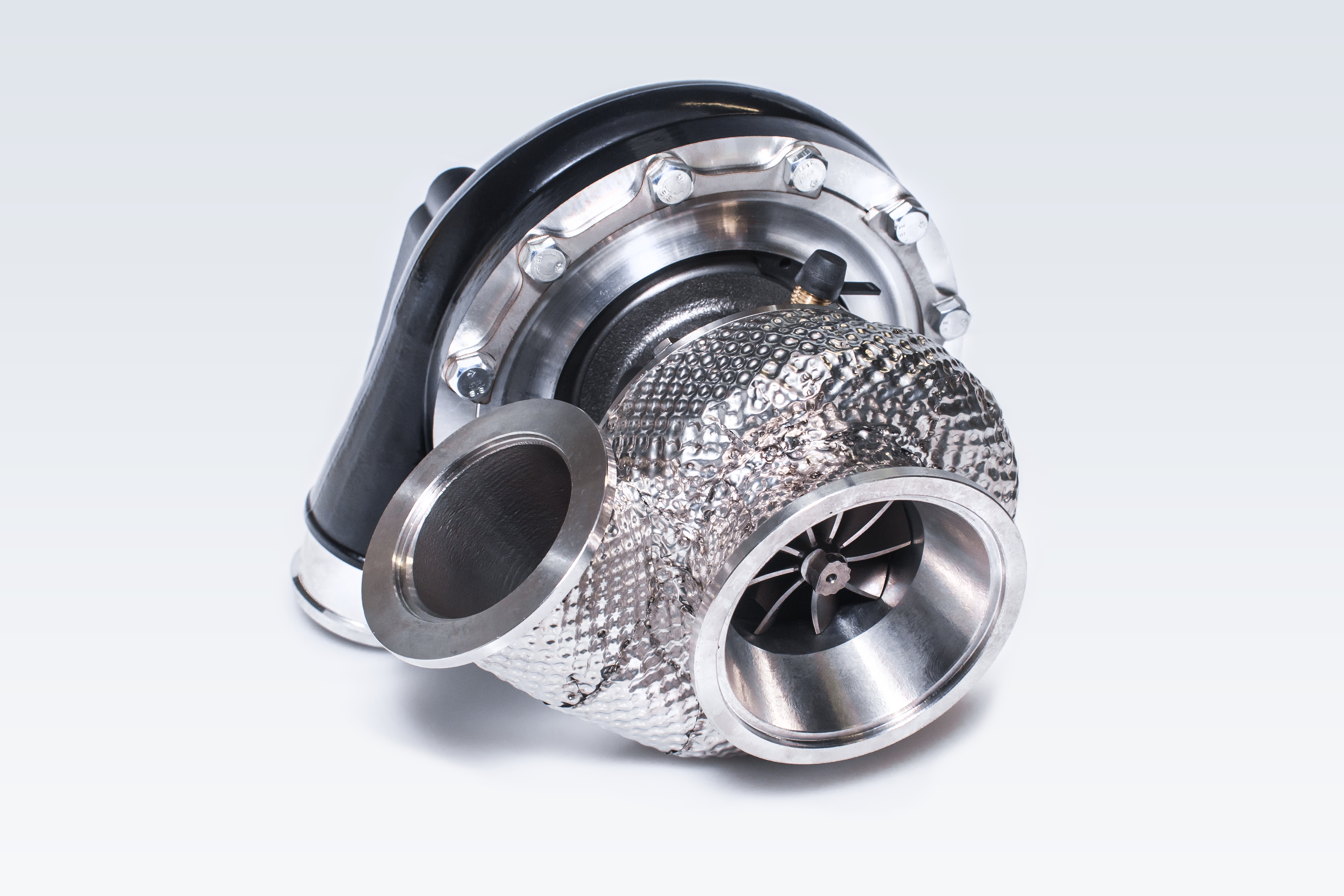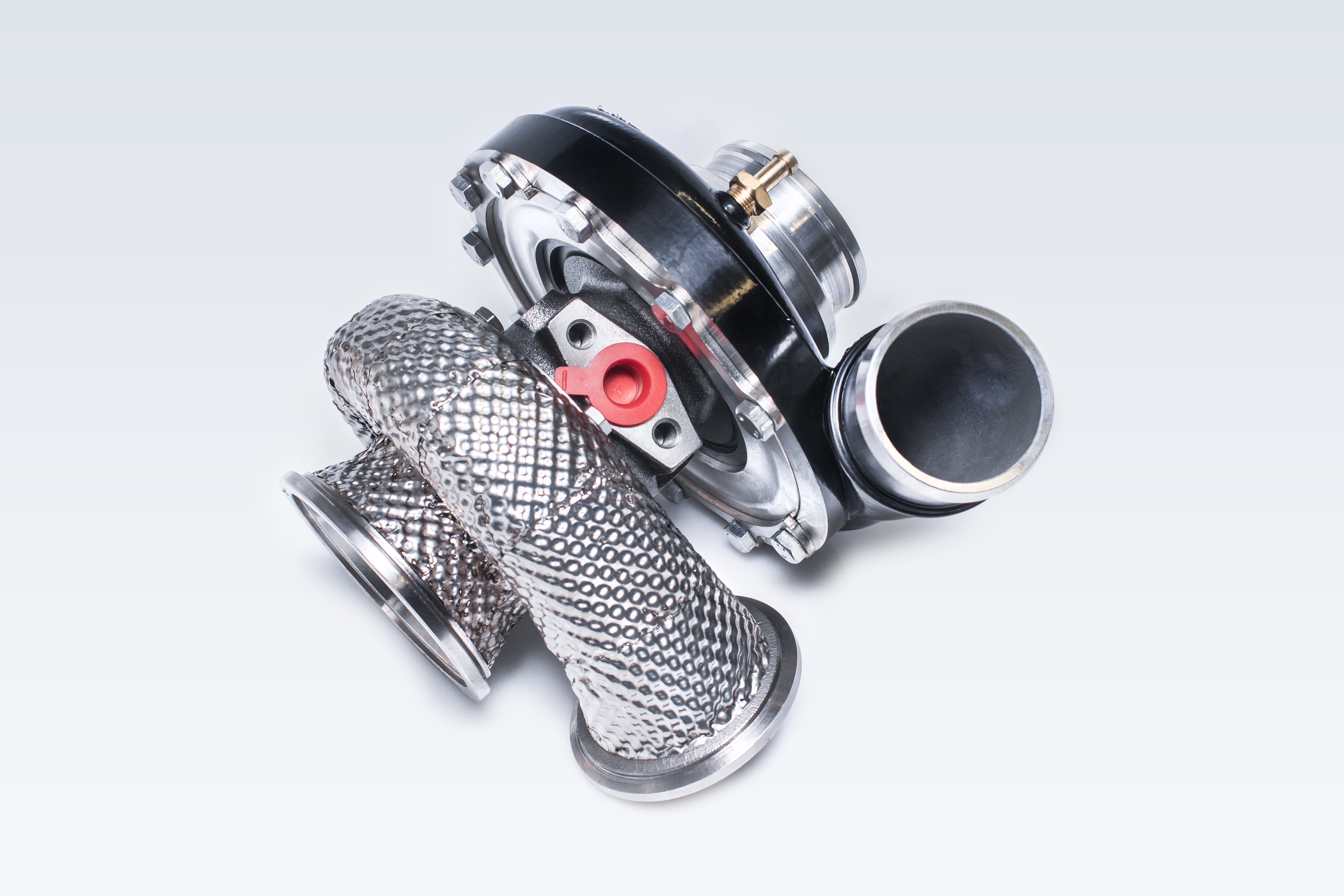 High performance turbocharger wtih 8cm2, 0.61AR single scroll turbine housing designed for heavy loads and high temperature. Two compressor side air outlet choices - 90° and straight for easier connection. Dual ceramic ball bearing and machined from solid aluminium compressor wheel makes it durable and efficient solution for motorsport use.o Power range: 400-500 HP; This turbocharger comes with 2 V-band sets (for turbine flange and exhaust). Compressor side: Ported shroud compressor housing; Compressor wheel: in-house made, reinforced 57/71 mm 9+0 blades machined from the solid aluminium; Intake:  Straight compressor housing - 63mm; (2,5")Compressor housing with 90° elbow - 76mm (3"); Air outlet: 51mm (2"); Core: Bearings: dual ceramic ball bearings; Cooling: water cooling with 2 x M14x1.5 ports; Lubrication: AN4 oil inlet with integrated oil restrictor; Turbine side: Housing: single scroll , 8cm2 AR: 0.61; Turbine wheel: custom design 60/55mm 9 blades; Flange: 2.25" V-band single scroll; Exhaust connection: 3" V-band clamp; Included Oil drain flange