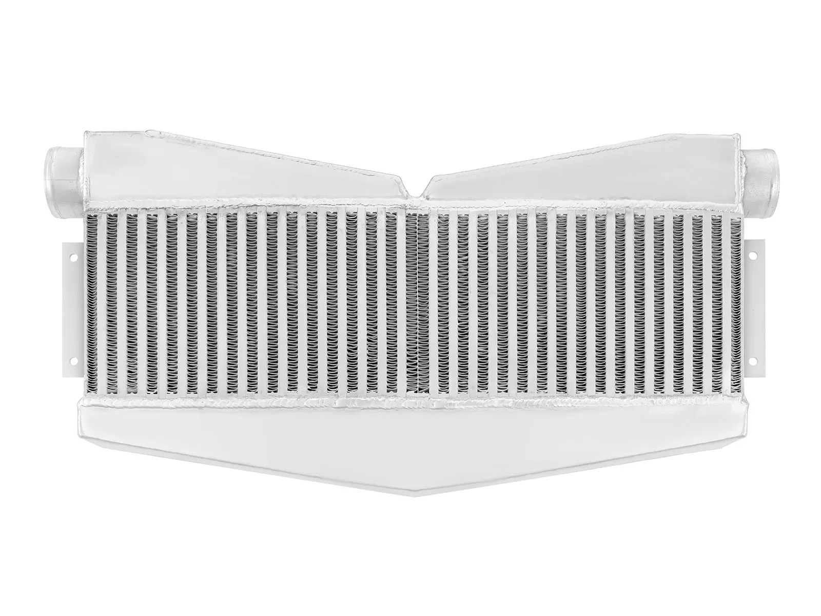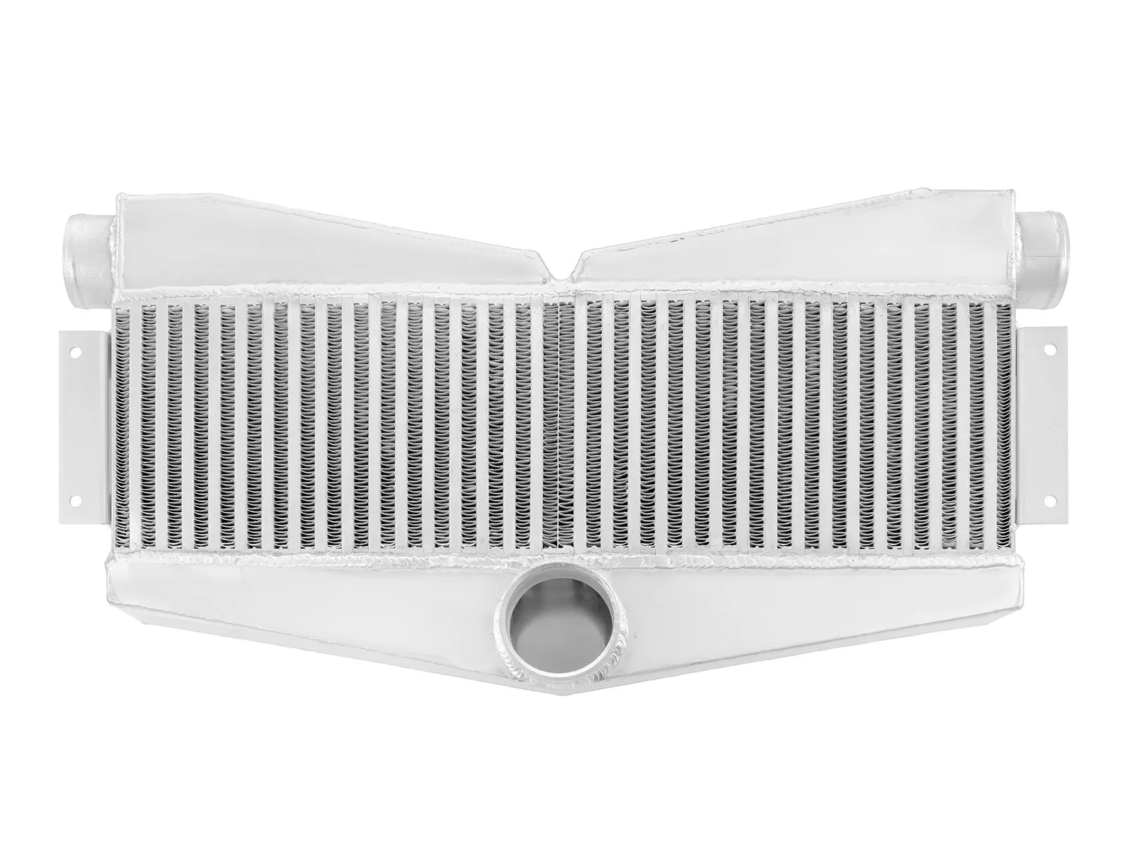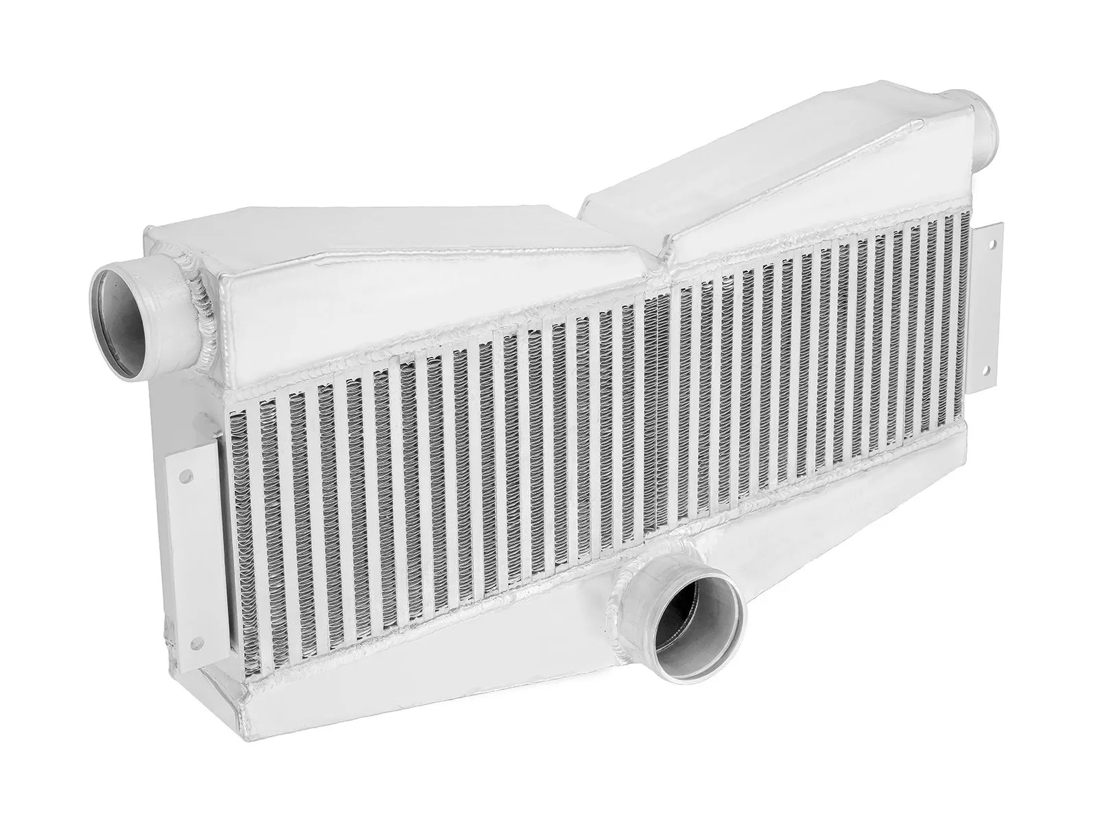 Intercooler o wymiarach rdzenia: 595x180x90mm, całkowite wymiary: 680x320x90mm, średnica wlotu 2x63mm, średnica wylotu 76mm wydajność do mocy 600KM. Posiada bardzo wydajny, zarówno wewnętrzny, jak i zewnętrzny rdzeń drugiego typu, grube ścianki wykonane z najwyższej jakości polerowanego aluminium, co gwarantuje ogromną wytrzymałość, świetne chłodzenie, a także doskonałe przepływy powietrza (w przeciwieństwie do intercoolerów z samochodów dostawczych nie "zapychają" dolotu). Znakomicie zastępują seryjne intercoolery zwiększając osiągi samochodu. Nasze intercoolery jako jedyne były testowane ciśnieniem ponad 10 barów - nawet tak duże ciśnienie nie robi na nich żadnego wrażenia. Za odprowadzenie ciepła odpowiedzialny jest zupełnie nowy, zewnętrzny, złożony z dwóch warstw rdzeń. Jego wewnętrzna część posiada cienkie, dodatkowo nacinane lamelki, które dzięki swojej przewiewności znakomicie oddają ciepło. Ich odpowiednie ułożenie oraz widoczne na zdjęciu nacięcia gwarantują optymalną wentylację (ogromna poprawa chłodzenia w porównaniu do zewnętrznego, montowanego w tańszych coolerach, gęstego rdzenia), natomiast zewnętrzna, mocna warstwa lamelek chroni go przed uszkodzeniami mechanicznymi. Intercooler - FMIC.EU