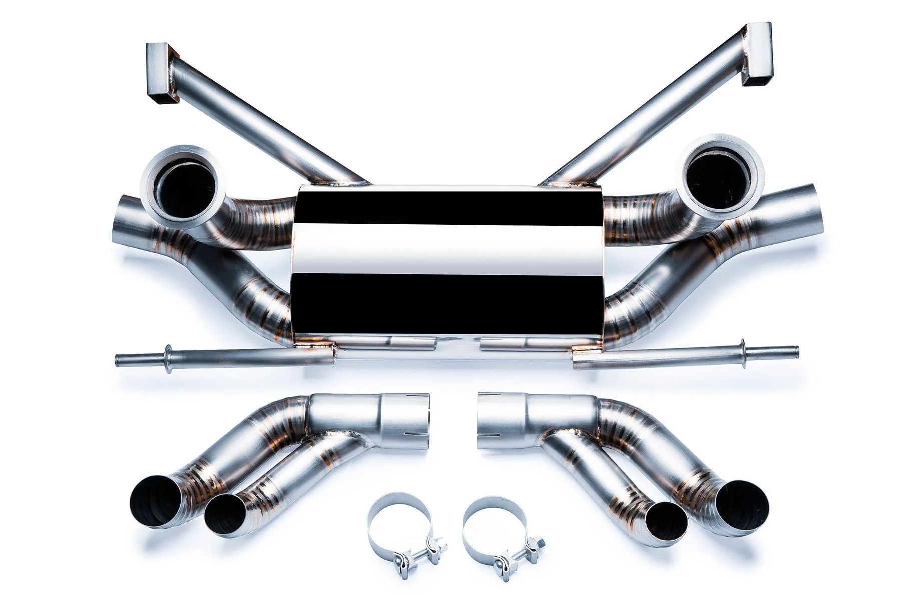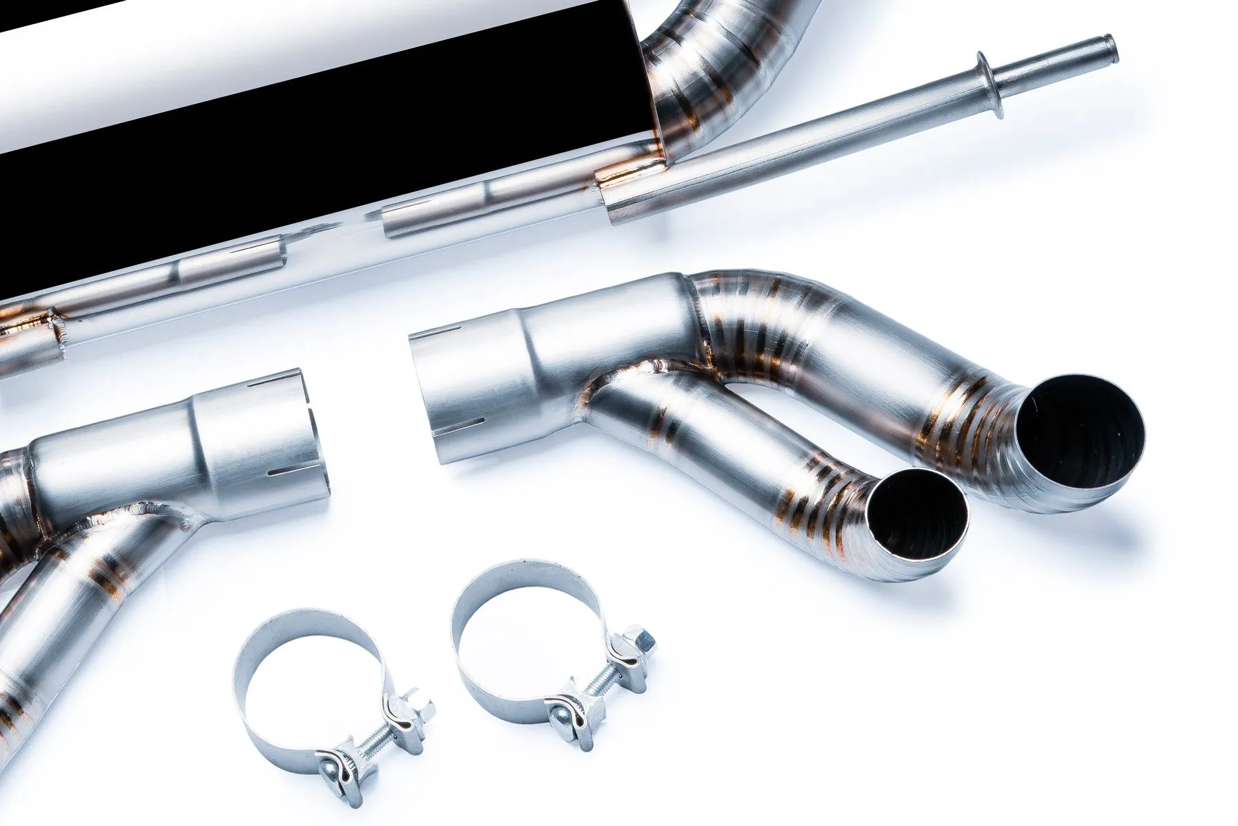 Tytanowy układ wydechowy Audi R8 5.2 V10 09-13 Producent: Vogler Racing Tytanowy wydech Vogler Racing zaprojektowany od podstaw z odpowiednio wyliczonymi średnicami rur oraz idealnie dobranymi rozmiarami tłumików w celu zwiększenia mocy i momentu obrotowego silnika. Wydech zapewnia maksymalną redukcją masy względem układów wydechowych ze stali nierdzewnej, gwarantując przy tym znakomitą wytrzymałość. Dzięki swojej konstrukcji wpływa na obniżenie ciśnienia zwrotnego w układzie wydechowym. Wydechy Vogler Racing znacząco poprawiają również wizualne walory samochodu oraz przede wszystkim jakość emitowanego przez wydech dźwięku. Tytan w porównaniu do stali jest odporny na korozję, bardzo lekki, a przy tym niezwykle wytrzymały. Na skutek kontaktu tytanu z tlenem na jego powierzchni tworzy się pasywacyjna warstwa tlenku tytanu o grubości ok. 2 nm, która dodatkowo zwiększa odporność na korozję. Niska masa, wysoka wytrzymałość w stosunku do gęstości materiału oraz wysoka temperatura topnienia sprawiają, że tytan używany jest do budowy najnowocześniejszych statków powietrznych, w tym myśliwców stealth i promów kosmicznych. Parametry:Waga: 7,12 kg Średnica rury: 2,75" (70mm) Średnica końcówki: 2,5" (63mm) Rodzaj wejścia: V-band 3,5"