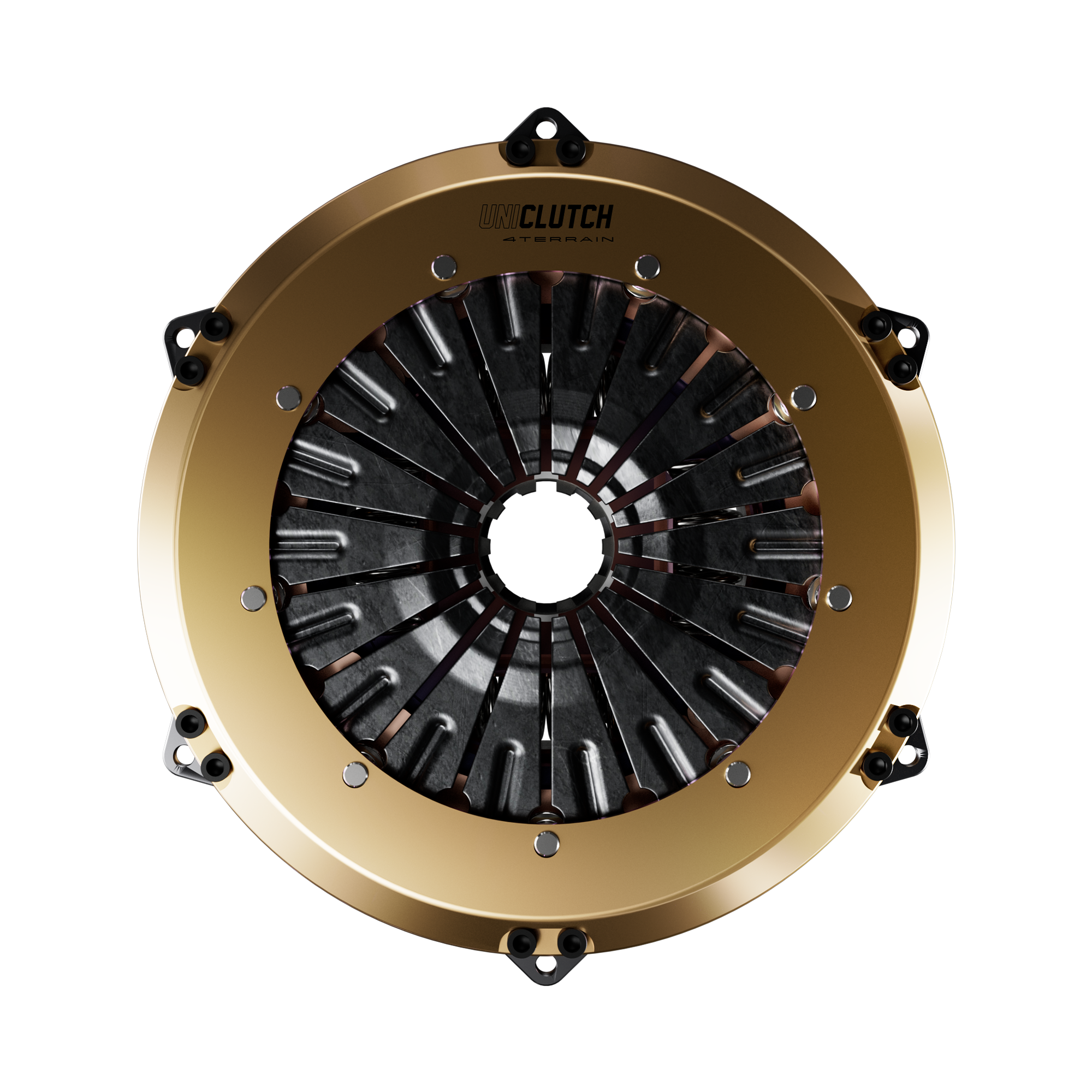 240 mm Twin Disc Organic | z RDC, Silent Shift, 4x4 Pedal Tune, wentylowana płyta pośrednia SGI Czy używasz auta na co dzień, holujesz ciężkie przyczepy lub często jeździsz w terenie? UniClutch 4Terrain został stworzony właśnie do takich zastosowań – także w mocno zmodyfikowanych pojazdach. Niezależnie od tego, czy zwiększyłeś moc i moment obrotowy, wykonałeś swap silnika, zamontowałeś większe koła i opony, podniosłeś DMC pojazdu czy regularnie holujesz ciężkie ładunki. To kompleksowe rozwiązanie najlepiej odpowiadające wymagającym zastosowaniom, zapewniające niezawodność i maksymalną wydajność nawet w najtrudniejszych warunkach. Cechy i korzyści • Dwutarczowy rdzeń organiczny, idealny do zastosowań o wysokiej mocy lub dużym obciążeniu, z wbudowaną technologią intercoolera zapewniającą do 40% ciągłego chłodzenia. • Zintegrowana powierzchnia cierna koła zamachowego eliminuje konieczność obróbki koła, oszczędzając czas i koszty. • Tryb 4x4 / Offroading Pedal Tune zapewnia doskonałą modulację podczas jazdy w terenie i manewrów typu rock crawling. • Elementy ze stali billet zapewniają do 3 razy wyższą wytrzymałość konstrukcji. • Technologia Silent Shift poprawia jakość i szybkość zmiany biegów, w dużym stopniu eliminując hałas i drgania. • Pokrywa sprzęgła o wysokim docisku (High Clamp Billet Cover Assembly) zwiększa trwałość i ogranicza ugięcie, zapewniając pełne wysprzęglanie bez efektu „ciągnięcia”. • Kute elementy wewnętrzne Quad Drive oferują wyjątkową wytrzymałość w ciężkich warunkach terenowych. • Sprężynowana tarcza sprzęgła umożliwia płynne przejście pomiędzy jazdą torową a codziennym użytkowaniem.