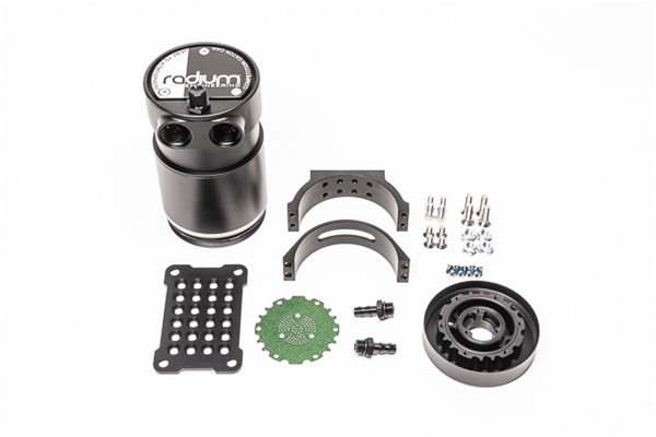 A high powered modified engine tends to generate excessive blow-by oil and gasses. In these cases, an ordinary small catch can may quickly fill with oil and not be adequate. Like the Radium Engineering Catch Cans, the AOS-R (Air Oil Separator, Return) is responsible for keeping blow-by oil and other pollutants out of the air intake, intercooler, manifold, etc. The main difference is that an AOS-R system returns oil back into the pan. This permits a service-free system. IMPORTANT INSTALLATION NOTES: -For the AOS-R to function properly, a return port on the engine must be available on the engine to the oil pan.-The AOS-R must be mounted high enough in the engine bay so that the port on the bottom is higher than the engine return port.-For heating purposes, engine coolant must be routed to the AOS-R to prevent condensation.Without a properly designed air oil separator, water condensation can develop and find its way in the oil pan contaminating engine oil.Engine coolant lines are routed through the Radium Engineering AOS-R via the 2 barbed fittings. The coolant enters a specially designed heating chamber Benefits-Lowers hydrocarbon emissions-Effectively raises the octane and increases engine performance with cleaner inlet air-Prevents oil buildup in the intake or intercooler system walls, throttle body, intake manifold, etc Included-Machined alumium Radium Engineering AOS-R-Aluminum mount that permits 360 degree rotation-Two 5/16" barbed fittings for coolant lines-Stainless steel hardware PortsInlet Port(s): 7/8"-14 threaded for 10AN ORB fittingsOutlet Port (VTE only): 7/8"-14 threaded for 10AN ORB fittingsReturn Port: 7/8"-14 threaded for 10AN ORB fittingsCoolant Ports: 7/16"-20 threaded, includes two 7mm (or 5/16") barb fittings MeasurementsAOS-R Height: 6.7" (without fittings)AOS-R Diameter: 3.45" RoundAOS-R Capacity: 20.3 oz (600mL) 20-0819 AOS-R, Universal, VTAThe vent-to-atmosphere air-oil separator has 2 side (inlet) ports. This is great for dual bank engines that have 2 crankcase vent ports. NOTE: For single crankcase vented engines, simply plug one of the inlet ports with Radium Engineering 14-0351. The VTA AOS-R features one giant non-restrictive outlet that is over 183% larger than the inner diameter of the 10AN inlets. This increase in volume slows air flow allowing contaminants to fall out of suspension. Additionally, contaminants are trapped with a diffuser permitting the oil sludge to fall back into the catch can preventing overspray in the engine bay. Furthermore, it is a dual stage design (located in the inlet and outlet). These free flowing chambers do not create any flow restriction. The included bracket system provides a ton of flexibility and permits full 360 degree rotation. Additionally, M6x1mm hardware is provided for chassis mounting. NOTE: Because of the vented "air leak" in the system, the VTA AOS-R is not recommended for mass-air flow (MAF) sensor engines. Instruction PDF