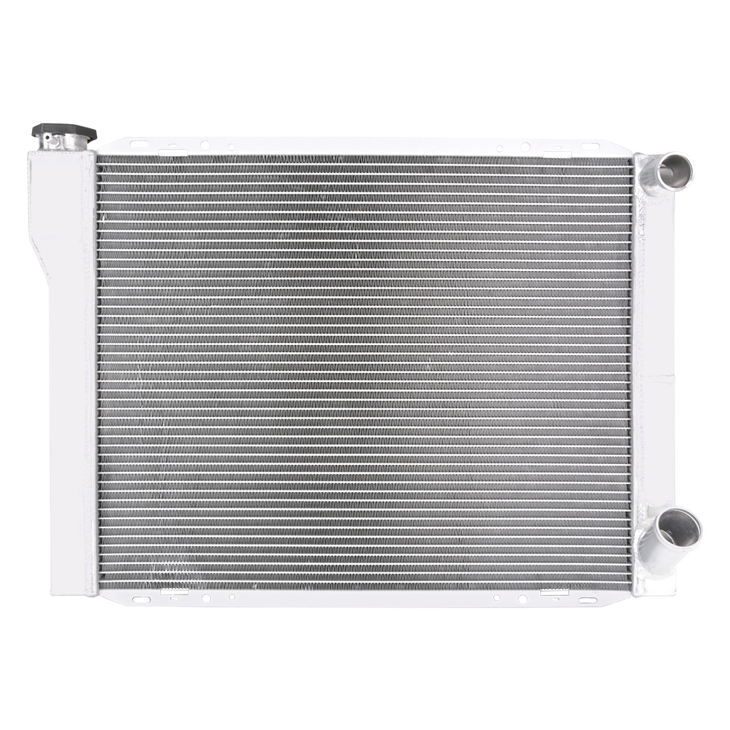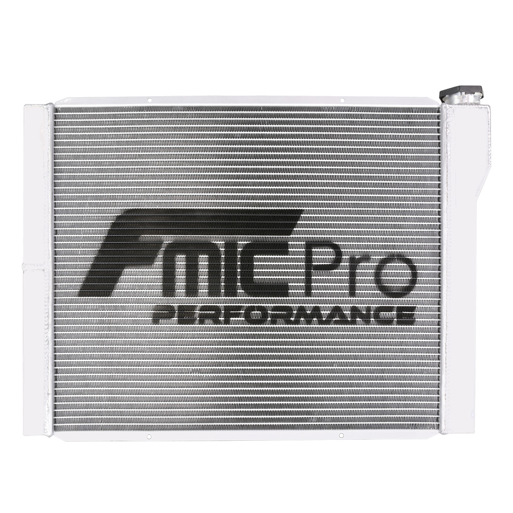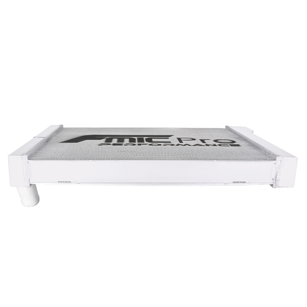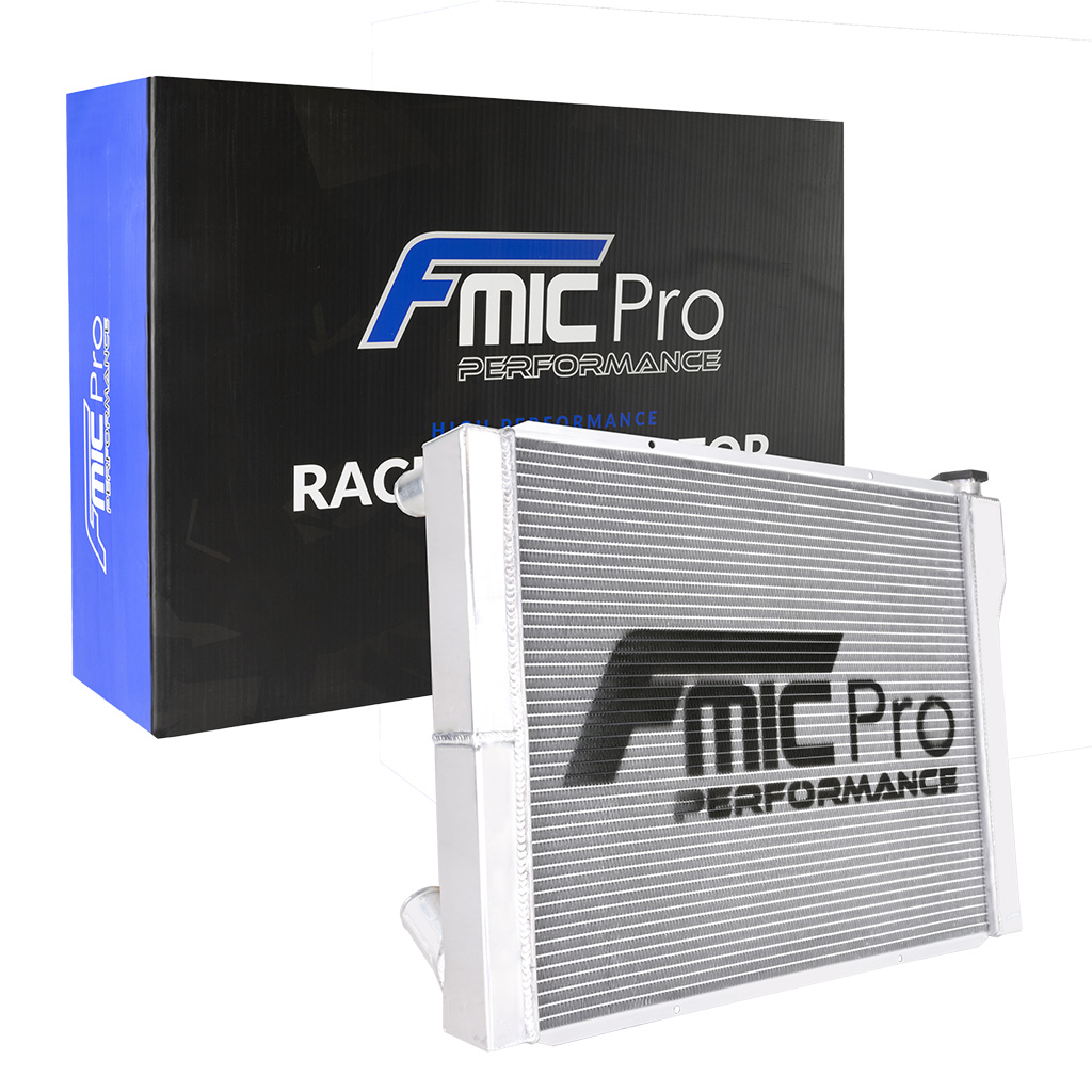 Uniwersalna chłodnica wody FMIC.Pro 686 mm x 508 mm x 76 mm Dual-Pass Uniwersalna aluminiowa chłodnica Dual-Pass FMIC.Pro została zaprojektowana do zastosowań tuningowych, wyczynowych oraz projektów typu swap, gdzie wymagana jest wysoka stabilność termiczna silnika. W pełni aluminiowy, spawany rdzeń oraz solidne, spawane boczki zapewniają dużą wytrzymałość, wysoką przewodność cieplną i odporność na obciążenia. Konstrukcja doskonale sprawdza się w silnikach o zwiększonej mocy oraz wszędzie tam, gdzie fabryczne chłodnice OEM nie zapewniają odpowiedniego chłodzenia. Chłodnica wykorzystuje układ dual-pass, w którym płyn przepływa przez rdzeń dwukrotnie. Wydłużona droga przepływu i wewnętrzna przegroda zwiększają powierzchnię wymiany ciepła, oferując 17–27% wyższą efektywność chłodzenia w porównaniu z konstrukcjami single-pass Specyfikacja techniczna Wymiary całkowite: 686 mm x 508 mm x 76 mm Wymiary rdzenia: 565 mm x 468 mm Grubość rdzenia: 76 mm Typ przepływu: dual-pass Liczba rzędów: 2 Średnica króćca wejścia : 38 mm Średnica króćca wyjścia 45 mm Korek chłodnicy: 2,0 bar