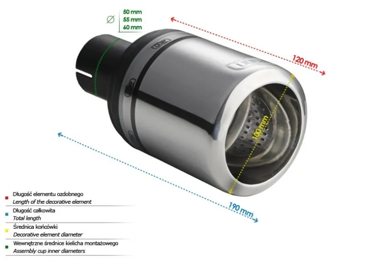 Końcówka wydechowa firmy Ulter Sport to doskonałe rozwiązanie w przypadku poszukiwania wysokiej jakości podzespołów przeznaczonych do budowy układów wydechowych. Dzięki zaawansowanej technologii i precyzyjnemu projektowi, końcówki wydechowe firmy Ulter Sport zapewniają doskonały przelot spalin, wydobywając z silnika maksymalną moc oraz podkreślając brzmienie jednostki napędowej.Dostępne w różnych konfiguracjach i stylach, końcówki wydechowe firmy Ulter Sport wzbogacają wygląd samochodu, dodając mu sportowego charakteru i agresywnego brzmienia. Dodatkowo, zastosowanie wysokiej jakości materiałów, takich jak polerowana stal nierdzewna, gwarantuje długotrwałą trwałość i odporność na korozję.Końcówki wydechowe firmy Ulter Sport doskonale współpracują z istniejącym układem wydechowym samochodu, zapewniając płynność przepływu spalin. Nie ważne, czy chcesz poprawić wydajność swojego sportowego samochodu, czy po prostu wprowadzić modyfikacje optyczne, końcówki wydechowe firmy Ulter Sport z pewnością spełnią Twoje oczekiwania. Dzięki ich montażowi, Twój samochód zyska nie tylko dodatkowe mocne brzmienie, ale również zyska na wyglądzie, stając się niepowtarzalnym i indywidualnym pojazdem.Jeśli szukasz sprawdzonego rozwiązania, które łączy w sobie wysoką jakość wykonania, wydajność i estetykę, końcówki wydechowe firmy Ulter Sport są dla Ciebie idealnym wyborem. Daj swojemu samochodowi jeszcze więcej charakteru decydując się na produkt tej renomowanej firmy. Kształt końcówki: okrągły Średnica montażowa [mm]: 50 Średnica zewnętrzna [mm]: 100 Długość całkowita końcówki [mm]: 190 Długość części ozdobnej [mm]: 120   BRAK OBEJM W ZESTAWIE