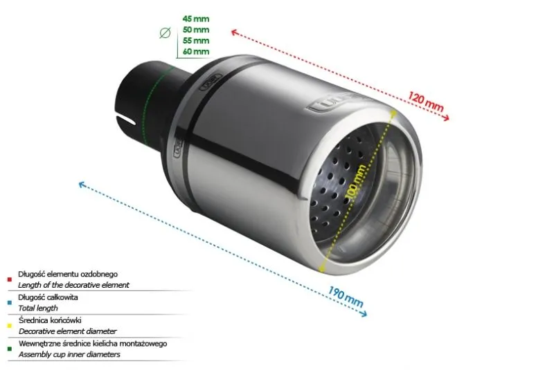 Końcówka wydechowa firmy Ulter Sport to doskonałe rozwiązanie w przypadku poszukiwania wysokiej jakości podzespołów przeznaczonych do budowy układów wydechowych. Dzięki zaawansowanej technologii i precyzyjnemu projektowi, końcówki wydechowe firmy Ulter Sport zapewniają doskonały przelot spalin, wydobywając z silnika maksymalną moc oraz podkreślając brzmienie jednostki napędowej.Dostępne w różnych konfiguracjach i stylach, końcówki wydechowe firmy Ulter Sport wzbogacają wygląd samochodu, dodając mu sportowego charakteru i agresywnego brzmienia. Dodatkowo, zastosowanie wysokiej jakości materiałów, takich jak polerowana stal nierdzewna, gwarantuje długotrwałą trwałość i odporność na korozję.Końcówki wydechowe firmy Ulter Sport doskonale współpracują z istniejącym układem wydechowym samochodu, zapewniając płynność przepływu spalin. Nie ważne, czy chcesz poprawić wydajność swojego sportowego samochodu, czy po prostu wprowadzić modyfikacje optyczne, końcówki wydechowe firmy Ulter Sport z pewnością spełnią Twoje oczekiwania. Dzięki ich montażowi, Twój samochód zyska nie tylko dodatkowe mocne brzmienie, ale również zyska na wyglądzie, stając się niepowtarzalnym i indywidualnym pojazdem.Jeśli szukasz sprawdzonego rozwiązania, które łączy w sobie wysoką jakość wykonania, wydajność i estetykę, końcówki wydechowe firmy Ulter Sport są dla Ciebie idealnym wyborem. Daj swojemu samochodowi jeszcze więcej charakteru decydując się na produkt tej renomowanej firmy. Kształt końcówki: okrągły Średnica montażowa [mm]: 50 Średnica zewnętrzna [mm]: 100 Długość całkowita końcówki [mm]: 190 Długość części ozdobnej [mm]: 120   BRAK OBEJM W ZESTAWIE