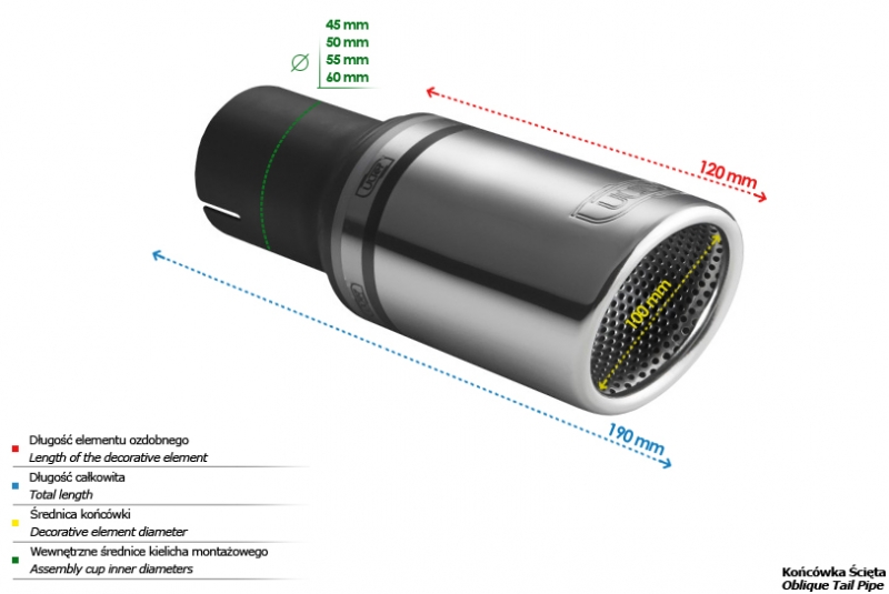 Końcówka wydechowa firmy Ulter Sport to doskonałe rozwiązanie w przypadku poszukiwania wysokiej jakości podzespołów przeznaczonych do budowy układów wydechowych. Dzięki zaawansowanej technologii i precyzyjnemu projektowi, końcówki wydechowe firmy Ulter Sport zapewniają doskonały przelot spalin, wydobywając z silnika maksymalną moc oraz podkreślając brzmienie jednostki napędowej.Dostępne w różnych konfiguracjach i stylach, końcówki wydechowe firmy Ulter Sport wzbogacają wygląd samochodu, dodając mu sportowego charakteru i agresywnego brzmienia. Dodatkowo, zastosowanie wysokiej jakości materiałów, takich jak polerowana stal nierdzewna, gwarantuje długotrwałą trwałość i odporność na korozję.Końcówki wydechowe firmy Ulter Sport doskonale współpracują z istniejącym układem wydechowym samochodu, zapewniając płynność przepływu spalin. Nie ważne, czy chcesz poprawić wydajność swojego sportowego samochodu, czy po prostu wprowadzić modyfikacje optyczne, końcówki wydechowe firmy Ulter Sport z pewnością spełnią Twoje oczekiwania. Dzięki ich montażowi, Twój samochód zyska nie tylko dodatkowe mocne brzmienie, ale również zyska na wyglądzie, stając się niepowtarzalnym i indywidualnym pojazdem.Jeśli szukasz sprawdzonego rozwiązania, które łączy w sobie wysoką jakość wykonania, wydajność i estetykę, końcówki wydechowe firmy Ulter Sport są dla Ciebie idealnym wyborem. Daj swojemu samochodowi jeszcze więcej charakteru decydując się na produkt tej renomowanej firmy. Kształt końcówki: okrągły Średnica montażowa [mm]: 60 Średnica zewnętrzna [mm]: 100 Długość całkowita końcówki [mm]: 190 Długość części ozdobnej [mm]: 120   BRAK OBEJM W ZESTAWIE