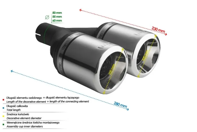 Końcówka wydechowa firmy Ulter Sport to doskonałe rozwiązanie w przypadku poszukiwania wysokiej jakości podzespołów przeznaczonych do budowy układów wydechowych. Dzięki zaawansowanej technologii i precyzyjnemu projektowi, końcówki wydechowe firmy Ulter Sport zapewniają doskonały przelot spalin, wydobywając z silnika maksymalną moc oraz podkreślając brzmienie jednostki napędowej.Dostępne w różnych konfiguracjach i stylach, końcówki wydechowe firmy Ulter Sport wzbogacają wygląd samochodu, dodając mu sportowego charakteru i agresywnego brzmienia. Dodatkowo, zastosowanie wysokiej jakości materiałów, takich jak polerowana stal nierdzewna, gwarantuje długotrwałą trwałość i odporność na korozję.Końcówki wydechowe firmy Ulter Sport doskonale współpracują z istniejącym układem wydechowym samochodu, zapewniając płynność przepływu spalin. Nie ważne, czy chcesz poprawić wydajność swojego sportowego samochodu, czy po prostu wprowadzić modyfikacje optyczne, końcówki wydechowe firmy Ulter Sport z pewnością spełnią Twoje oczekiwania. Dzięki ich montażowi, Twój samochód zyska nie tylko dodatkowe mocne brzmienie, ale również zyska na wyglądzie, stając się niepowtarzalnym i indywidualnym pojazdem.Jeśli szukasz sprawdzonego rozwiązania, które łączy w sobie wysoką jakość wykonania, wydajność i estetykę, końcówki wydechowe firmy Ulter Sport są dla Ciebie idealnym wyborem. Daj swojemu samochodowi jeszcze więcej charakteru decydując się na produkt tej renomowanej firmy. Kształt końcówki: okrągły Średnica montażowa [mm]: 60 Średnica zewnętrzna [mm]: 2x100 Długość całkowita końcówki [mm]: 280 Długość części ozdobnej [mm]: 230 BRAK OBEJM W ZESTAWIE