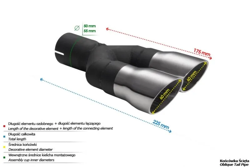 Końcówka wydechowa firmy Ulter Sport to doskonałe rozwiązanie w przypadku poszukiwania wysokiej jakości podzespołów przeznaczonych do budowy układów wydechowych. Dzięki zaawansowanej technologii i precyzyjnemu projektowi, końcówki wydechowe firmy Ulter Sport zapewniają doskonały przelot spalin, wydobywając z silnika maksymalną moc oraz podkreślając brzmienie jednostki napędowej.Dostępne w różnych konfiguracjach i stylach, końcówki wydechowe firmy Ulter Sport wzbogacają wygląd samochodu, dodając mu sportowego charakteru i agresywnego brzmienia. Dodatkowo, zastosowanie wysokiej jakości materiałów, takich jak polerowana stal nierdzewna, gwarantuje długotrwałą trwałość i odporność na korozję.Końcówki wydechowe firmy Ulter Sport doskonale współpracują z istniejącym układem wydechowym samochodu, zapewniając płynność przepływu spalin. Nie ważne, czy chcesz poprawić wydajność swojego sportowego samochodu, czy po prostu wprowadzić modyfikacje optyczne, końcówki wydechowe firmy Ulter Sport z pewnością spełnią Twoje oczekiwania. Dzięki ich montażowi, Twój samochód zyska nie tylko dodatkowe mocne brzmienie, ale również zyska na wyglądzie, stając się niepowtarzalnym i indywidualnym pojazdem.Jeśli szukasz sprawdzonego rozwiązania, które łączy w sobie wysoką jakość wykonania, wydajność i estetykę, końcówki wydechowe firmy Ulter Sport są dla Ciebie idealnym wyborem. Daj swojemu samochodowi jeszcze więcej charakteru decydując się na produkt tej renomowanej firmy. Kształt końcówki: okrągły Średnica montażowa [mm]: 50 Średnica zewnętrzna [mm]: 2x60 Długość całkowita końcówki [mm]: 225 Długość części ozdobnej [mm]: 170 BRAK OBEJM W ZESTAWIE