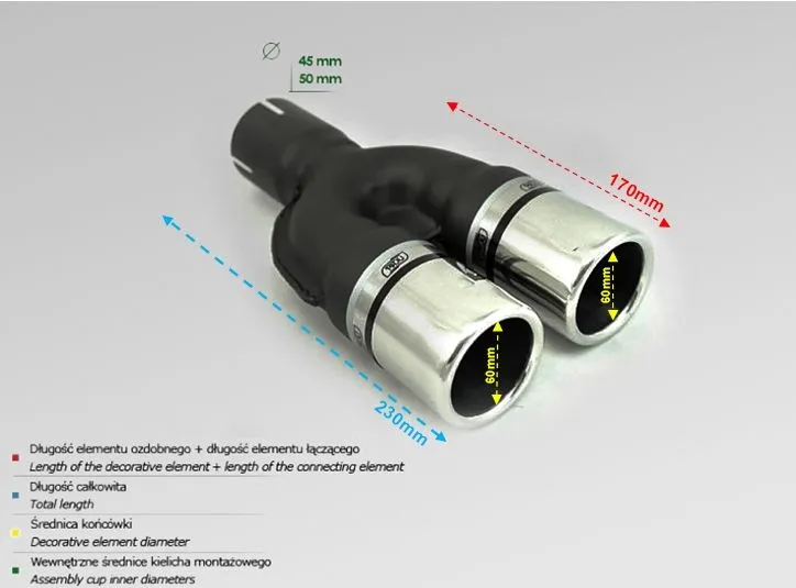 Końcówka wydechowa firmy Ulter Sport to doskonałe rozwiązanie w przypadku poszukiwania wysokiej jakości podzespołów przeznaczonych do budowy układów wydechowych. Dzięki zaawansowanej technologii i precyzyjnemu projektowi, końcówki wydechowe firmy Ulter Sport zapewniają doskonały przelot spalin, wydobywając z silnika maksymalną moc oraz podkreślając brzmienie jednostki napędowej.Dostępne w różnych konfiguracjach i stylach, końcówki wydechowe firmy Ulter Sport wzbogacają wygląd samochodu, dodając mu sportowego charakteru i agresywnego brzmienia. Dodatkowo, zastosowanie wysokiej jakości materiałów, takich jak polerowana stal nierdzewna, gwarantuje długotrwałą trwałość i odporność na korozję.Końcówki wydechowe firmy Ulter Sport doskonale współpracują z istniejącym układem wydechowym samochodu, zapewniając płynność przepływu spalin. Nie ważne, czy chcesz poprawić wydajność swojego sportowego samochodu, czy po prostu wprowadzić modyfikacje optyczne, końcówki wydechowe firmy Ulter Sport z pewnością spełnią Twoje oczekiwania. Dzięki ich montażowi, Twój samochód zyska nie tylko dodatkowe mocne brzmienie, ale również zyska na wyglądzie, stając się niepowtarzalnym i indywidualnym pojazdem.Jeśli szukasz sprawdzonego rozwiązania, które łączy w sobie wysoką jakość wykonania, wydajność i estetykę, końcówki wydechowe firmy Ulter Sport są dla Ciebie idealnym wyborem. Daj swojemu samochodowi jeszcze więcej charakteru decydując się na produkt tej renomowanej firmy. Kształt końcówki: okrągły Średnica montażowa [mm]: 50 Średnica zewnętrzna [mm]: 2x60 Długość całkowita końcówki [mm]: 230 Długość części ozdobnej [mm]: 170 BRAK OBEJM W ZESTAWIE