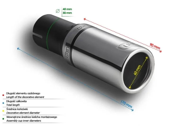 Końcówka wydechowa firmy Ulter Sport to doskonałe rozwiązanie w przypadku poszukiwania wysokiej jakości podzespołów przeznaczonych do budowy układów wydechowych. Dzięki zaawansowanej technologii i precyzyjnemu projektowi, końcówki wydechowe firmy Ulter Sport zapewniają doskonały przelot spalin, wydobywając z silnika maksymalną moc oraz podkreślając brzmienie jednostki napędowej.Dostępne w różnych konfiguracjach i stylach, końcówki wydechowe firmy Ulter Sport wzbogacają wygląd samochodu, dodając mu sportowego charakteru i agresywnego brzmienia. Dodatkowo, zastosowanie wysokiej jakości materiałów, takich jak polerowana stal nierdzewna, gwarantuje długotrwałą trwałość i odporność na korozję.Końcówki wydechowe firmy Ulter Sport doskonale współpracują z istniejącym układem wydechowym samochodu, zapewniając płynność przepływu spalin. Nie ważne, czy chcesz poprawić wydajność swojego sportowego samochodu, czy po prostu wprowadzić modyfikacje optyczne, końcówki wydechowe firmy Ulter Sport z pewnością spełnią Twoje oczekiwania. Dzięki ich montażowi, Twój samochód zyska nie tylko dodatkowe mocne brzmienie, ale również zyska na wyglądzie, stając się niepowtarzalnym i indywidualnym pojazdem.Jeśli szukasz sprawdzonego rozwiązania, które łączy w sobie wysoką jakość wykonania, wydajność i estetykę, końcówki wydechowe firmy Ulter Sport są dla Ciebie idealnym wyborem. Daj swojemu samochodowi jeszcze więcej charakteru decydując się na produkt tej renomowanej firmy. Kształt końcówki: okrągły Średnica montażowa [mm]: 45 Średnica zewnętrzna [mm]: 60 Długość całkowita końcówki [mm]: 170 Długość części ozdobnej [mm]: 90 BRAK OBEJM W ZESTAWIE