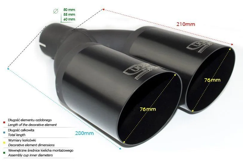 Końcówka wydechowa firmy Ulter Sport to doskonałe rozwiązanie w przypadku poszukiwania wysokiej jakości podzespołów przeznaczonych do budowy układów wydechowych. Dzięki zaawansowanej technologii i precyzyjnemu projektowi, końcówki wydechowe firmy Ulter Sport zapewniają doskonały przelot spalin, wydobywając z silnika maksymalną moc oraz podkreślając brzmienie jednostki napędowej.Dostępne w różnych konfiguracjach i stylach, końcówki wydechowe firmy Ulter Sport wzbogacają wygląd samochodu, dodając mu sportowego charakteru i agresywnego brzmienia. Dodatkowo, zastosowanie wysokiej jakości materiałów, takich jak polerowana stal nierdzewna, gwarantuje długotrwałą trwałość i odporność na korozję.Końcówki wydechowe firmy Ulter Sport doskonale współpracują z istniejącym układem wydechowym samochodu, zapewniając płynność przepływu spalin. Nie ważne, czy chcesz poprawić wydajność swojego sportowego samochodu, czy po prostu wprowadzić modyfikacje optyczne, końcówki wydechowe firmy Ulter Sport z pewnością spełnią Twoje oczekiwania. Dzięki ich montażowi, Twój samochód zyska nie tylko dodatkowe mocne brzmienie, ale również zyska na wyglądzie, stając się niepowtarzalnym i indywidualnym pojazdem.Jeśli szukasz sprawdzonego rozwiązania, które łączy w sobie wysoką jakość wykonania, wydajność i estetykę, końcówki wydechowe firmy Ulter Sport są dla Ciebie idealnym wyborem. Daj swojemu samochodowi jeszcze więcej charakteru decydując się na produkt tej renomowanej firmy. Kształt końcówki: okrągły Średnica montażowa [mm]: 55 Średnica zewnętrzna [mm]: 2x76 Długość całkowita końcówki [mm]: 300 Długość części ozdobnej [mm]: 230   BRAK OBEJM W ZESTAWIE