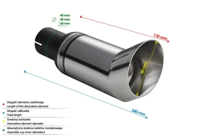 Końcówka wydechowa firmy Ulter Sport to doskonałe rozwiązanie w przypadku poszukiwania wysokiej jakości podzespołów przeznaczonych do budowy układów wydechowych. Dzięki zaawansowanej technologii i precyzyjnemu projektowi, końcówki wydechowe firmy Ulter Sport zapewniają doskonały przelot spalin, wydobywając z silnika maksymalną moc oraz podkreślając brzmienie jednostki napędowej.Dostępne w różnych konfiguracjach i stylach, końcówki wydechowe firmy Ulter Sport wzbogacają wygląd samochodu, dodając mu sportowego charakteru i agresywnego brzmienia. Dodatkowo, zastosowanie wysokiej jakości materiałów, takich jak polerowana stal nierdzewna, gwarantuje długotrwałą trwałość i odporność na korozję.Końcówki wydechowe firmy Ulter Sport doskonale współpracują z istniejącym układem wydechowym samochodu, zapewniając płynność przepływu spalin. Nie ważne, czy chcesz poprawić wydajność swojego sportowego samochodu, czy po prostu wprowadzić modyfikacje optyczne, końcówki wydechowe firmy Ulter Sport z pewnością spełnią Twoje oczekiwania. Dzięki ich montażowi, Twój samochód zyska nie tylko dodatkowe mocne brzmienie, ale również zyska na wyglądzie, stając się niepowtarzalnym i indywidualnym pojazdem.Jeśli szukasz sprawdzonego rozwiązania, które łączy w sobie wysoką jakość wykonania, wydajność i estetykę, końcówki wydechowe firmy Ulter Sport są dla Ciebie idealnym wyborem. Daj swojemu samochodowi jeszcze więcej charakteru decydując się na produkt tej renomowanej firmy. Kształt końcówki: okrągły Średnica montażowa [mm]: 55 Średnica zewnętrzna [mm]: 80 Długość całkowita końcówki [mm]: 240 Długość części ozdobnej [mm]: 170 BRAK OBEJM W ZESTAWIE