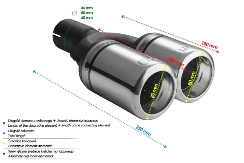 Końcówka wydechowa firmy Ulter Sport to doskonałe rozwiązanie w przypadku poszukiwania wysokiej jakości podzespołów przeznaczonych do budowy układów wydechowych. Dzięki zaawansowanej technologii i precyzyjnemu projektowi, końcówki wydechowe firmy Ulter Sport zapewniają doskonały przelot spalin, wydobywając z silnika maksymalną moc oraz podkreślając brzmienie jednostki napędowej.Dostępne w różnych konfiguracjach i stylach, końcówki wydechowe firmy Ulter Sport wzbogacają wygląd samochodu, dodając mu sportowego charakteru i agresywnego brzmienia. Dodatkowo, zastosowanie wysokiej jakości materiałów, takich jak polerowana stal nierdzewna, gwarantuje długotrwałą trwałość i odporność na korozję.Końcówki wydechowe firmy Ulter Sport doskonale współpracują z istniejącym układem wydechowym samochodu, zapewniając płynność przepływu spalin. Nie ważne, czy chcesz poprawić wydajność swojego sportowego samochodu, czy po prostu wprowadzić modyfikacje optyczne, końcówki wydechowe firmy Ulter Sport z pewnością spełnią Twoje oczekiwania. Dzięki ich montażowi, Twój samochód zyska nie tylko dodatkowe mocne brzmienie, ale również zyska na wyglądzie, stając się niepowtarzalnym i indywidualnym pojazdem.Jeśli szukasz sprawdzonego rozwiązania, które łączy w sobie wysoką jakość wykonania, wydajność i estetykę, końcówki wydechowe firmy Ulter Sport są dla Ciebie idealnym wyborem. Daj swojemu samochodowi jeszcze więcej charakteru decydując się na produkt tej renomowanej firmy. Kształt końcówki: okrągły Średnica montażowa [mm]: 50 Średnica zewnętrzna [mm]: 2x80 Długość całkowita końcówki [mm]: 250 Długość części ozdobnej [mm]: 200/180 BRAK OBEJM W ZESTAWIE