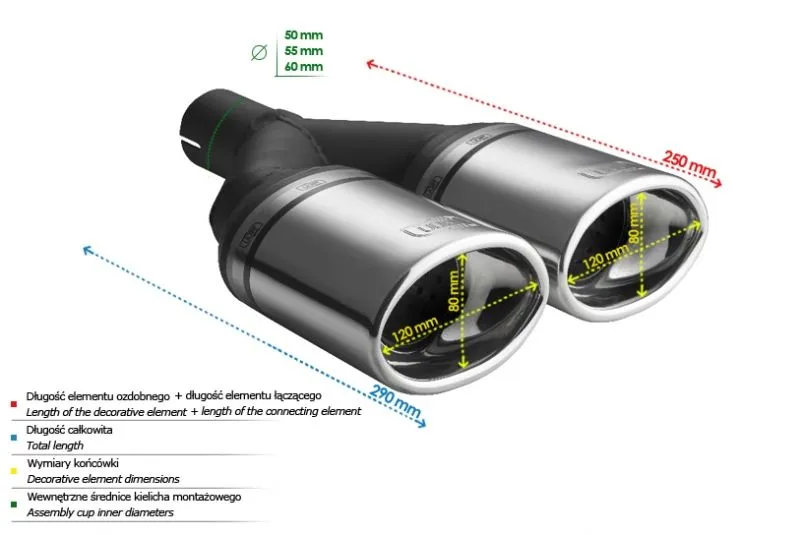 Końcówka wydechowa firmy Ulter Sport to doskonałe rozwiązanie w przypadku poszukiwania wysokiej jakości podzespołów przeznaczonych do budowy układów wydechowych. Dzięki zaawansowanej technologii i precyzyjnemu projektowi, końcówki wydechowe firmy Ulter Sport zapewniają doskonały przelot spalin, wydobywając z silnika maksymalną moc oraz podkreślając brzmienie jednostki napędowej.Dostępne w różnych konfiguracjach i stylach, końcówki wydechowe firmy Ulter Sport wzbogacają wygląd samochodu, dodając mu sportowego charakteru i agresywnego brzmienia. Dodatkowo, zastosowanie wysokiej jakości materiałów, takich jak polerowana stal nierdzewna, gwarantuje długotrwałą trwałość i odporność na korozję.Końcówki wydechowe firmy Ulter Sport doskonale współpracują z istniejącym układem wydechowym samochodu, zapewniając płynność przepływu spalin. Nie ważne, czy chcesz poprawić wydajność swojego sportowego samochodu, czy po prostu wprowadzić modyfikacje optyczne, końcówki wydechowe firmy Ulter Sport z pewnością spełnią Twoje oczekiwania. Dzięki ich montażowi, Twój samochód zyska nie tylko dodatkowe mocne brzmienie, ale również zyska na wyglądzie, stając się niepowtarzalnym i indywidualnym pojazdem.Jeśli szukasz sprawdzonego rozwiązania, które łączy w sobie wysoką jakość wykonania, wydajność i estetykę, końcówki wydechowe firmy Ulter Sport są dla Ciebie idealnym wyborem. Daj swojemu samochodowi jeszcze więcej charakteru decydując się na produkt tej renomowanej firmy. Kształt końcówki: owalny Średnica montażowa [mm]: 50 Średnica zewnętrzna [mm]: 2x 120x80 Długość całkowita końcówki [mm]: 290 Długość części ozdobnej [mm]: 250 BRAK OBEJM W ZESTAWIE