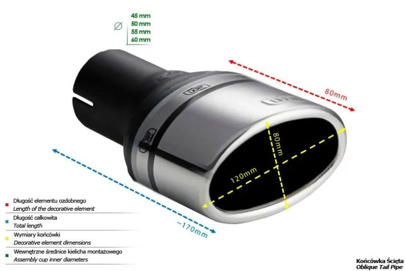 Końcówka wydechowa firmy Ulter Sport to doskonałe rozwiązanie w przypadku poszukiwania wysokiej jakości podzespołów przeznaczonych do budowy układów wydechowych. Dzięki zaawansowanej technologii i precyzyjnemu projektowi, końcówki wydechowe firmy Ulter Sport zapewniają doskonały przelot spalin, wydobywając z silnika maksymalną moc oraz podkreślając brzmienie jednostki napędowej.Dostępne w różnych konfiguracjach i stylach, końcówki wydechowe firmy Ulter Sport wzbogacają wygląd samochodu, dodając mu sportowego charakteru i agresywnego brzmienia. Dodatkowo, zastosowanie wysokiej jakości materiałów, takich jak polerowana stal nierdzewna, gwarantuje długotrwałą trwałość i odporność na korozję.Końcówki wydechowe firmy Ulter Sport doskonale współpracują z istniejącym układem wydechowym samochodu, zapewniając płynność przepływu spalin. Nie ważne, czy chcesz poprawić wydajność swojego sportowego samochodu, czy po prostu wprowadzić modyfikacje optyczne, końcówki wydechowe firmy Ulter Sport z pewnością spełnią Twoje oczekiwania. Dzięki ich montażowi, Twój samochód zyska nie tylko dodatkowe mocne brzmienie, ale również zyska na wyglądzie, stając się niepowtarzalnym i indywidualnym pojazdem.Jeśli szukasz sprawdzonego rozwiązania, które łączy w sobie wysoką jakość wykonania, wydajność i estetykę, końcówki wydechowe firmy Ulter Sport są dla Ciebie idealnym wyborem. Daj swojemu samochodowi jeszcze więcej charakteru decydując się na produkt tej renomowanej firmy. Kształt końcówki: owalny Średnica montażowa [mm]: 60 Średnica zewnętrzna [mm]: 120x80 Długość całkowita końcówki [mm]: 170 Długość części ozdobnej [mm]: 80 BRAK OBEJM W ZESTAWIE