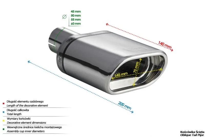 Końcówka wydechowa firmy Ulter Sport to doskonałe rozwiązanie w przypadku poszukiwania wysokiej jakości podzespołów przeznaczonych do budowy układów wydechowych. Dzięki zaawansowanej technologii i precyzyjnemu projektowi, końcówki wydechowe firmy Ulter Sport zapewniają doskonały przelot spalin, wydobywając z silnika maksymalną moc oraz podkreślając brzmienie jednostki napędowej.Dostępne w różnych konfiguracjach i stylach, końcówki wydechowe firmy Ulter Sport wzbogacają wygląd samochodu, dodając mu sportowego charakteru i agresywnego brzmienia. Dodatkowo, zastosowanie wysokiej jakości materiałów, takich jak polerowana stal nierdzewna, gwarantuje długotrwałą trwałość i odporność na korozję.Końcówki wydechowe firmy Ulter Sport doskonale współpracują z istniejącym układem wydechowym samochodu, zapewniając płynność przepływu spalin. Nie ważne, czy chcesz poprawić wydajność swojego sportowego samochodu, czy po prostu wprowadzić modyfikacje optyczne, końcówki wydechowe firmy Ulter Sport z pewnością spełnią Twoje oczekiwania. Dzięki ich montażowi, Twój samochód zyska nie tylko dodatkowe mocne brzmienie, ale również zyska na wyglądzie, stając się niepowtarzalnym i indywidualnym pojazdem.Jeśli szukasz sprawdzonego rozwiązania, które łączy w sobie wysoką jakość wykonania, wydajność i estetykę, końcówki wydechowe firmy Ulter Sport są dla Ciebie idealnym wyborem. Daj swojemu samochodowi jeszcze więcej charakteru decydując się na produkt tej renomowanej firmy. Kształt końcówki: owalny Średnica montażowa [mm]: 55 Średnica zewnętrzna [mm]: 145x75 Długość całkowita końcówki [mm]: 260 Długość części ozdobnej [mm]: 200 BRAK OBEJM W ZESTAWIE