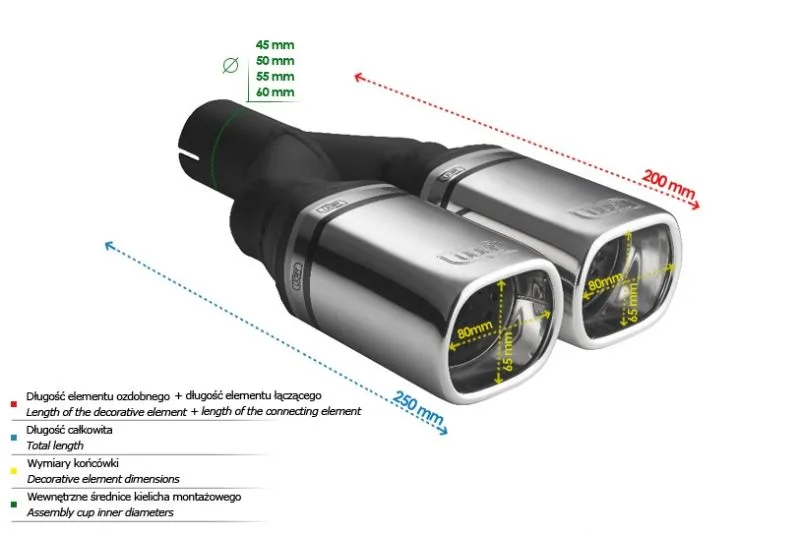 Końcówka wydechowa firmy Ulter Sport to doskonałe rozwiązanie w przypadku poszukiwania wysokiej jakości podzespołów przeznaczonych do budowy układów wydechowych. Dzięki zaawansowanej technologii i precyzyjnemu projektowi, końcówki wydechowe firmy Ulter Sport zapewniają doskonały przelot spalin, wydobywając z silnika maksymalną moc oraz podkreślając brzmienie jednostki napędowej.Dostępne w różnych konfiguracjach i stylach, końcówki wydechowe firmy Ulter Sport wzbogacają wygląd samochodu, dodając mu sportowego charakteru i agresywnego brzmienia. Dodatkowo, zastosowanie wysokiej jakości materiałów, takich jak polerowana stal nierdzewna, gwarantuje długotrwałą trwałość i odporność na korozję.Końcówki wydechowe firmy Ulter Sport doskonale współpracują z istniejącym układem wydechowym samochodu, zapewniając płynność przepływu spalin. Nie ważne, czy chcesz poprawić wydajność swojego sportowego samochodu, czy po prostu wprowadzić modyfikacje optyczne, końcówki wydechowe firmy Ulter Sport z pewnością spełnią Twoje oczekiwania. Dzięki ich montażowi, Twój samochód zyska nie tylko dodatkowe mocne brzmienie, ale również zyska na wyglądzie, stając się niepowtarzalnym i indywidualnym pojazdem.Jeśli szukasz sprawdzonego rozwiązania, które łączy w sobie wysoką jakość wykonania, wydajność i estetykę, końcówki wydechowe firmy Ulter Sport są dla Ciebie idealnym wyborem. Daj swojemu samochodowi jeszcze więcej charakteru decydując się na produkt tej renomowanej firmy. Kształt końcówki: prostokątny Średnica montażowa [mm]: 60 Średnica zewnętrzna [mm]: 2x 80x65 Długość całkowita końcówki [mm]: 250 Długość części ozdobnej [mm]: 200 BRAK OBEJM W ZESTAWIE