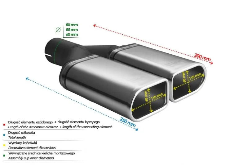 Końcówka wydechowa firmy Ulter Sport to doskonałe rozwiązanie w przypadku poszukiwania wysokiej jakości podzespołów przeznaczonych do budowy układów wydechowych. Dzięki zaawansowanej technologii i precyzyjnemu projektowi, końcówki wydechowe firmy Ulter Sport zapewniają doskonały przelot spalin, wydobywając z silnika maksymalną moc oraz podkreślając brzmienie jednostki napędowej.Dostępne w różnych konfiguracjach i stylach, końcówki wydechowe firmy Ulter Sport wzbogacają wygląd samochodu, dodając mu sportowego charakteru i agresywnego brzmienia. Dodatkowo, zastosowanie wysokiej jakości materiałów, takich jak polerowana stal nierdzewna, gwarantuje długotrwałą trwałość i odporność na korozję.Końcówki wydechowe firmy Ulter Sport doskonale współpracują z istniejącym układem wydechowym samochodu, zapewniając płynność przepływu spalin. Nie ważne, czy chcesz poprawić wydajność swojego sportowego samochodu, czy po prostu wprowadzić modyfikacje optyczne, końcówki wydechowe firmy Ulter Sport z pewnością spełnią Twoje oczekiwania. Dzięki ich montażowi, Twój samochód zyska nie tylko dodatkowe mocne brzmienie, ale również zyska na wyglądzie, stając się niepowtarzalnym i indywidualnym pojazdem.Jeśli szukasz sprawdzonego rozwiązania, które łączy w sobie wysoką jakość wykonania, wydajność i estetykę, końcówki wydechowe firmy Ulter Sport są dla Ciebie idealnym wyborem. Daj swojemu samochodowi jeszcze więcej charakteru decydując się na produkt tej renomowanej firmy. Kształt końcówki: specjalny Średnica montażowa [mm]: 55 Średnica zewnętrzna [mm]: 2x 110x65 Długość części ozdobnej [mm]: 200 BRAK OBEJM W ZESTAWIE