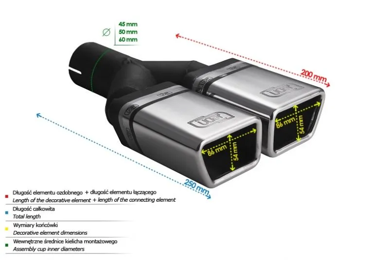 Końcówka wydechowa firmy Ulter Sport to doskonałe rozwiązanie w przypadku poszukiwania wysokiej jakości podzespołów przeznaczonych do budowy układów wydechowych. Dzięki zaawansowanej technologii i precyzyjnemu projektowi, końcówki wydechowe firmy Ulter Sport zapewniają doskonały przelot spalin, wydobywając z silnika maksymalną moc oraz podkreślając brzmienie jednostki napędowej.Dostępne w różnych konfiguracjach i stylach, końcówki wydechowe firmy Ulter Sport wzbogacają wygląd samochodu, dodając mu sportowego charakteru i agresywnego brzmienia. Dodatkowo, zastosowanie wysokiej jakości materiałów, takich jak polerowana stal nierdzewna, gwarantuje długotrwałą trwałość i odporność na korozję.Końcówki wydechowe firmy Ulter Sport doskonale współpracują z istniejącym układem wydechowym samochodu, zapewniając płynność przepływu spalin. Nie ważne, czy chcesz poprawić wydajność swojego sportowego samochodu, czy po prostu wprowadzić modyfikacje optyczne, końcówki wydechowe firmy Ulter Sport z pewnością spełnią Twoje oczekiwania. Dzięki ich montażowi, Twój samochód zyska nie tylko dodatkowe mocne brzmienie, ale również zyska na wyglądzie, stając się niepowtarzalnym i indywidualnym pojazdem.Jeśli szukasz sprawdzonego rozwiązania, które łączy w sobie wysoką jakość wykonania, wydajność i estetykę, końcówki wydechowe firmy Ulter Sport są dla Ciebie idealnym wyborem. Daj swojemu samochodowi jeszcze więcej charakteru decydując się na produkt tej renomowanej firmy. Kształt końcówki: specjalny Średnica montażowa [mm]: 45 Średnica zewnętrzna [mm]: 2x 86x54 Długość całkowita końcówki [mm]: 250 Długość części ozdobnej [mm]: 200   BRAK OBEJM W ZESTAWIE