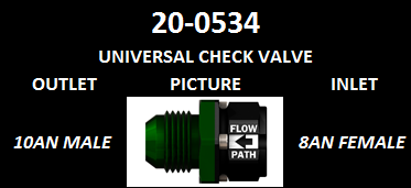 Jednokierunkowy zawór zwrotny umożliwia przepływ tylko w jednym kierunku. Uniwersalny zawór zwrotny Radium Engineering ma lekki korpus z anodyzowanego aluminium z uszczelkami wykonanymi z Vitonu i osprzętem ze stali nierdzewnej. Aerodynamiczny kształt wewnętrznego tłoka gwarantuje gładki strumień laminarny. Żeńskie porty -AN mogą być łączone męskimi gwintami stożkowymi i/lub złączkami męskimi ORB (pierścienie O-ring). Kierunek przepływu jest wygrawerowany laserowo z boku części. Zawór zwrotny jest kompatybilny z wieloma cieczami, w tym benzyną, etanolem, metanolem, olejem napędowym, wodą, płynem chłodzącym, olejem itp. SPECYFIKACJA: Uszczelnienie korpusu: Viton Uszczelka tłoka: Viton Osprzęt: stal nierdzewna Materiał sprężyny: stal nierdzewna Materiał tłoka: Stal nierdzewna Materiał korpusu: anodowane aluminium Typ zaworu zwrotnego: Tłok sprężynowy Duży sześciokąt: 30 mm (lub 1-3/16") Długość bez adapterów: 1,72 "(43,6 mm) Maksymalne ciśnienie robocze: 1000 + psi @ 70F Ciśnienie podtrzymania przepływu wstecznego: 1000 + psi @ 70F W swojej podstawowej formie bez łączników adaptera, uniwersalny zawór zwrotny wykorzystuje męski wylot 10AN i żeński wlot 8AN.