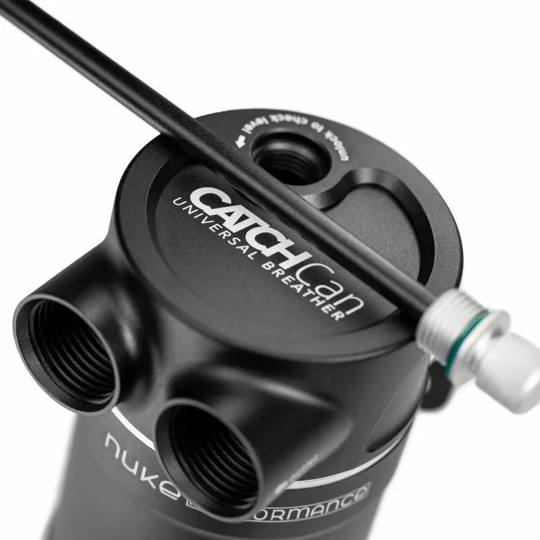 Nuke Performance Universal Catch Can 0.25 liter, the newest and smallest addition to the lineup of oil catch cans. Universal single inlet and outlet oil catch can with internal baffling and with a new oversized semicircle 300-micron filter disc. Equipped with AN-10 ORB threads both for the inlet and outlet port. For motorsports, tuning, and street usage for any kind of vehicle that is in need of a crankcase gas catch can. 0.25 liter catch can capacity 360° rotating stainless steel bracket Oversized 300-micron internal filter disc AN-10 ORB inlet / outlet, for the highest possible flow Easy drainage through the 1/4" drainage plug Dipstick for fast and easy reading of internal level The Nuke Performance Universal Catch Can 0.25 liter (1,05 US cups) is the newest addition to the oil catch can lineup, and thanks to its small form factor it suits your every engine bay, a perfect complement to the bigger dual-inlet catch cans from Nuke Performance. Can be used for both atmospheric and recirculating setups. World-class internal filtration with the oversized internal 300-micron filter disc, maximum functionality in a small form factor. The unique internals prevents particles from escaping the oil catch can, thanks to its internal 300-micron filter disc that is used for both atmospheric and recirculating installation. The internal filter dis makes sure to filter your crankcase gasses, and gives you outstanding filtration which saves your engine in the short and long run. Using a universal oil catch can for your engine prevents contamination buildup, enhances engine performance by cleaning up the intake air, and being able to measure the contamination level gives you an oportunity to keep an eye on the wear and health of your engine. A new and smaller catch can, for easy application into even the most narrow engine bays. This new addition to the Nuke Performance oil catch can lineup offer the same quality and function but in a much smaller design. Yes, size matters. This is our smallest oil catch can yet The 0.25 liter capacity is perfect for everyday vehicles and is a perfect complement to the bigger catch cans that Nuke Performance offers for motorsports applications, such as the lightweight real-carbon 0.75 liter catch can with dual inlets. Universal Catch Can 0.25 liter Specifications: For more information about specifications, view the product sheet. Catch can capacity 0.25 liter (1.06 US cup) Inlet ports / threads 1 x AN-10 ORB - view assortment Outlet port / thread 1 x AN-10 ORB - view assortment Filtered outlet port YES, 300-micron filter disc Replaceable filter disc YES, Part # 2700-06 Drainage port / thread 1 x 1/4 BSPP, plug included Included bracket 360° rotating stainless steel bracket Dipstick YES, aluminum dipstick included Height * 149 mm (5.86") Width 66 mm (2.60") Depth 85 mm (3.34") Weight 439 g (0.97 lb) Setup available Recirculating / Atmospheric use Part # 270-01-201 Nuke Performance Universal Catch Can 0.25 liter includes: 1 x 0.25 liter capacity universal catch can 1 x 360° rotating stainless steel bracket 1 x 300 micron filter disc for the outlet port 1 x Anodized aluminum dipstick for level reading 1 x 1/4 BSPP Plug (drainage port)