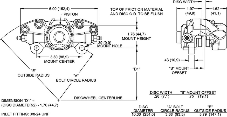 Zacisk hamulcowy wyścigowy WLD-19/ST Zacisk hamulcowy WLD-19/ST to zaawansowana wersja wyścigowego zacisku WLD-19, zaprojektowana z myślą o maksymalnej wytrzymałości, oszczędności masy oraz bardzo wysokiej efektywności docisku w profesjonalnych zastosowaniach torowych. Jest przeznaczony przede wszystkim dla pojazdów kategorii Formula Ford oraz innych samochodów formułowych skonfigurowanych pod tradycyjne zaciski typu LD19 z mocowaniem Lug Mount. Konstrukcja ta zapewnia stabilną i mocną siłę hamowania w najbardziej wymagających warunkach wyścigowych. Korpus zacisku wykonano z kutego aluminium o wysokiej wytrzymałości, przy zachowaniu niskiej masy wynoszącej około 2,3 funta. Kluczową różnicą w modelu WLD-19/ST jest zastosowanie specjalnych tłoków Thermlock®, które skutecznie ograniczają transfer ciepła z tarczy do zacisku i płynu hamulcowego. Rozwiązanie to poprawia odporność układu na przegrzewanie oraz zwiększa stabilność działania podczas długotrwałego hamowania w wysokich temperaturach. Wszystkie zaciski serii WLD-19 wykorzystują te same punkty mocowania, wysokość oraz offset co tradycyjne zaciski LD20, co umożliwia bezpośrednią wymianę bez konieczności przeróbek zawieszenia lub układu hamulcowego. Zacisk współpracuje z klockami Wilwood typu 5310 oraz wszystkimi odpowiednikami pasującymi do oryginalnych modeli LD19, oferując szeroką dostępność mieszanek ciernych do sportu i wyścigów. Tłoki Liczba tłoków: 2 Powierzchnia tłoków (in²): 2,06 Typ tłoków: Thermlock® Osłona przeciwpyłowa: brak Wymiary tarczy Szerokość tarczy (in): 0,28 Średnica tarczy (in): 10,00 Wymiary klocków Powierzchnia klocków (in²): 3,79 Objętość klocków (in³): 1,48 Klasa zastosowania i materiał Materiał: kute aluminium Masa (lbs): 2,3 Kolory i wykończenie Kolor: anodowany Wykończenie: twarde anodowanie Type III Mocowanie Rozstaw mocowania (in): 3,50 Strona montażu: uniwersalna Typ mocowania: Lug Specyfikacja Kompatybilność tarcz Nominalna szerokość tarczy (in): 0,28 Maksymalna szerokość tarczy (in): 0,28 Minimalna szerokość tarczy (in): 0,22 Maksymalna średnica tarczy (in): 10,00 Minimalna średnica tarczy (in): 10,00 Specyfikacja klocków hamulcowych Typ klocka 1: 5310 Całkowita powierzchnia klocków (in²): 3,79 Całkowita objętość klocków (in³): 1,48 Specyfikacja tłoków Średnica tłoka 1 (in): 1,62 Całkowita powierzchnia tłoków (in²): 2,06 Dane montażowe Typ mocowania: Lug Strona montażu: uniwersalna Rozstaw mocowania (in): 3,50 Rozmiar otworu montażowego (in): 0,39 Wysokość mocowania (in): 1,76 Gwint przyłącza: 3/8-24