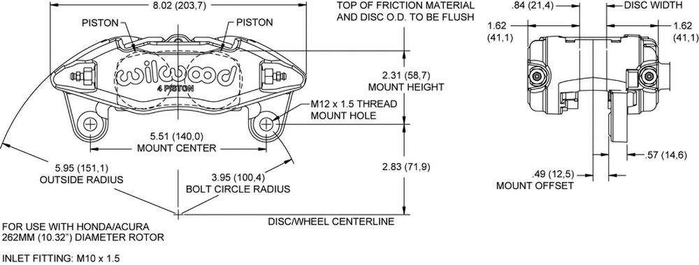 Zacisk hamulcowy Forged DPHA Zacisk hamulcowy Forged DynaPro Honda/Acura (DPHA) reprezentuje najnowszą generację zacisków zaprojektowanych wyłącznie jako bezpośredni zamiennik typu bolt-on dla modeli Honda i Acura fabrycznie wyposażonych w tarcze hamulcowe o średnicy 262 mm. Zacisk montowany jest bezpośrednio do seryjnych punktów mocowania na fabrycznych zwrotnicach, współpracuje z oryginalną tarczą o średnicy 262 mm, akceptuje seryjne przewody hamulcowe oraz mieści się w wielu fabrycznych aluminiowych felgach 15". Konstrukcja DPHA oparta jest na sprawdzonej serii czterotłoczkowych zacisków Wilwood DynaPro. Korpus wykonany z kutego aluminium zapewnia wysoką sztywność i skuteczną siłę docisku, gwarantując precyzyjną i pewną reakcję hamowania. Cztery tłoki ze stali nierdzewnej zapewniają równomierny rozkład nacisku na klocki, a jednocześnie wysoką odporność na korozję oraz ograniczone przenikanie ciepła, co pozwala utrzymać stabilną temperaturę pracy i długą żywotność zacisku. Zaciski DPHA są w pełni kompatybilne z większością seryjnych pomp hamulcowych i zachowują pełną funkcjonalność systemu ABS. Dostępne są w kolorze czarnym, czerwonym oraz Competition Blue, z wysokopołyskowym, wysokotemperaturowym lakierem proszkowym odpornym na działanie płynu hamulcowego, z charakterystycznym logo Wilwood. Komponenty hamulcowe Wilwood Performance powstają w oparciu o technologie rozwijane przez dekady dominacji w sportach motorowych oraz standardy jakości Zero PPM, stosowane przez czołowych producentów OE na świecie. Zapewniają one nie tylko poprawę skuteczności hamowania, ale także długotrwałą, niezawodną eksploatację w pojazdach Honda i Acura. Tłoki Liczba tłoków: 4 Powierzchnia tłoków: 4,12 in² Typ tłoków: stal nierdzewna Osłona przeciwpyłowa: brak Wymiary tarczy Szerokość tarczy: 0,83 in Średnica tarczy: 10,32 in Wymiary klocków Powierzchnia klocków: 6,36 in² Objętość klocków: 2,1 in³ Klasa obciążenia i materiał Materiał: kute aluminium Masa: 3,9 lb Kolory i wykończenie Kolor: czarny Wykończenie: czarny lakier proszkowy Mocowanie Rozstaw mocowania: 5,51 in Strona montażu: uniwersalna Typ mocowania: lug Specyfikacja Kompatybilność tarcz Szerokość tarczy: 0,83 in Maksymalna szerokość tarczy: 0,83 in Minimalna szerokość tarczy: 0,78 in Maksymalna średnica tarczy: 10,32 in Minimalna średnica tarczy: 10,32 in Specyfikacja klocków hamulcowych Typ klocka 1: 7812 Typ klocka 2: N/A Typ klocka 3: N/A Całkowita powierzchnia klocków: 6,36 in² Całkowita objętość klocków: 2,1 in³ Specyfikacja tłoków Średnica tłoka 1: 1,62 in Średnica tłoka 2: 1,62 in Całkowita powierzchnia tłoków: 4,12 in² Specyfikacja montażowa Typ mocowania: lug Strona montażu: uniwersalna Rozstaw mocowania: 5,51 in Średnica otworu montażowego: 0,47 in Wysokość montażowa: 2,37 in Gwint przyłącza: M10 × 1,50
