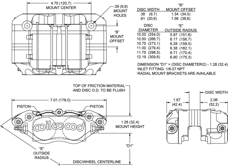 Wąski zacisk hamulcowy Narrow Dynapro, montaż radialny Czterotłoczkowe zaciski Wilwood Narrow Dynapro z montażem radialnym łączą wszechstronność mocowania radialnego ze smukłym profilem, wysoką wytrzymałością oraz bardzo dużą trwałością w trudnych warunkach eksploatacyjnych. Przy masie całkowitej sięgającej nawet 3,58 funta Dynapro stał się preferowanym wyborem dla szerokiego zakresu zastosowań sportowych, rajdowych i off-roadowych. Seria Narrow Dynapro wykorzystuje technologię wyścigową oraz nową generację ulepszeń Wilwood zwiększających osiągi. Wytrzymałość Dynapro wynika z połączenia procesu produkcyjnego i konstrukcji. Kucie metodą stress-flow ukierunkowuje wewnętrzną strukturę ziaren metalu zgodnie z konturem korpusu zacisku, co zapewnia większą wytrzymałość niż w przypadku elementów frezowanych z litego bloku lub odlewów. Konstrukcja korpusu opracowana przy użyciu analizy MES (FEA) wykorzystuje radialne przejścia pomiędzy gniazdami tłoków a mostkami zacisku. Eliminuje to stopnie i ostre krawędzie w krytycznych obszarach nośnych oraz znacząco zwiększa odporność na ugięcia i rozdzielanie korpusu pod wysokim obciążeniem. Testy ugięć strukturalnych i przemieszczeń objętościowych potwierdziły skuteczność tej koncepcji — efektem jest twardy pedał hamulca i wysoka siła hamowania. Narrow DynaPro współpracuje z tarczami o średnicy do 12,19” i wykorzystuje grubościenne tłoki ze stali nierdzewnej, zapewniające dodatkową ochronę przed korozją oraz ograniczające przenikanie ciepła z klocków hamulcowych. Wszystkie zaciski Dynapro mogą być także opcjonalnie wyposażone w tłoki Thermlock, zapewniające maksymalną ochronę termiczną w aplikacjach o długotrwałym, wysokim obciążeniu cieplnym. Zacisk Dynapro zawiera również inne rozwiązania poprawiające parametry pracy: stalowe płytki mostka SRS ograniczają zużycie mostka powodowane przez „żłobienie” klocków, a jednocześnie redukują hałas i drgania podczas zadziałania. Wewnętrzne kanały płynu eliminują potrzebę stosowania zewnętrznych przewodów wyrównawczych, a cztery odpowietrzniki w narożach umożliwiają skuteczne usuwanie gazów niezależnie od pozycji montażu. Tłoki Liczba tłoków: 4 Powierzchnia tłoków: 1,98 in² Typ tłoków: stal nierdzewna Osłony przeciwpyłowe: nie Wymiary tarczy Szerokość tarczy: 0,81 in Średnica tarczy: 12,88 in Wymiary klocków Powierzchnia klocków: 6,36 in² Objętość klocków: 2,1 in³ Klasa pracy i materiał Materiał: aluminium z litego bloku (billet) Masa: 4,0 lb Kolory i wykończenie Kolor: czarny Wykończenie: czarna powłoka proszkowa Mocowanie Rozstaw montażowy: 4,75 in Strona montażu: uniwersalna Typ montażu: radialny Specyfikacja Kompatybilność z tarczami Nominalna szerokość tarczy: 0,81 in Maksymalna szerokość tarczy: 0,86 in Minimalna szerokość tarczy: 0,75 in Maksymalna średnica tarczy: 12,88 in Minimalna średnica tarczy: 11,75 in Specyfikacja klocków hamulcowych Typ klocków 1: 7812 Typ klocków 2: N-A Typ klocków 3: N-A Całkowita powierzchnia klocków: 6,36 in² Całkowita objętość klocków: 2,1 in³ Specyfikacja tłoków Średnica tłoka 1: 1,12 in Średnica tłoka 2: 1,12 in Całkowita powierzchnia tłoków: 1,98 in² Specyfikacja montażu Typ montażu: radialny Strona montażu: uniwersalna Rozstaw montażowy: 4,75 in Średnica otworów montażowych: 0,39 in Wysokość montażowa: 1,61 in Gwint przyłącza hydraulicznego: 1/8-27 NPT