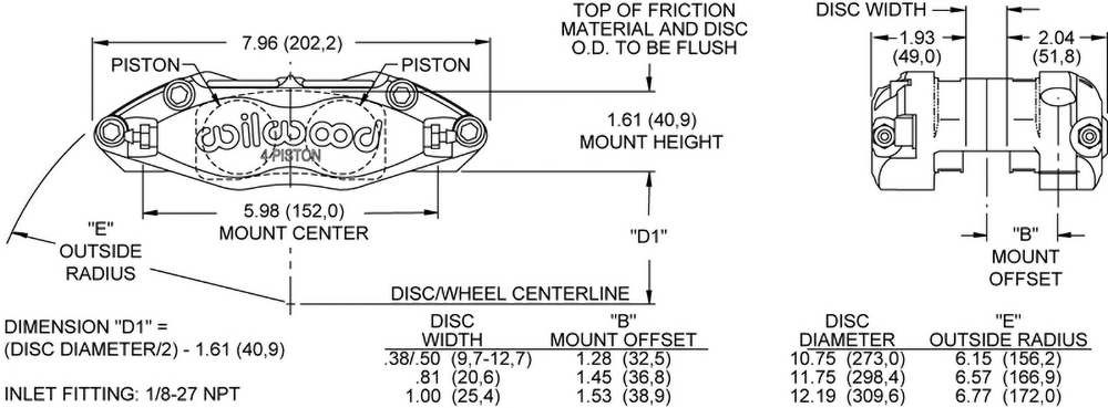 Zacisk Dynapro z uszczelnieniem przeciwpyłowym, montaż radialny Czterotłoczkowe zaciski Wilwood Dynapro z uszczelnieniem przeciwpyłowym i montażem radialnym (DPR-DS) stanowią przykład ciągłego rozwoju i udoskonalania konstrukcji Wilwood. Łączą czystą technologię wyścigową z nową generacją rozwiązań zwiększających osiągi. Dynapro-DS oferuje wszechstronność montażu radialnego, smukły profil, wysoką wytrzymałość oraz wyjątkową trwałość w trudnych warunkach eksploatacyjnych. Zastosowanie uszczelnień typu dust wiper umożliwia użytkowanie zacisku w regionach wymagających ochrony środowiskowej. Dzięki masie całkowitej wynoszącej około 3.58 funta, seria Dynapro jest chętnie wybierana do zastosowań sportowych, rajdowych oraz off-road. Wytrzymałość zacisku Dynapro jest wynikiem połączenia zaawansowanego procesu produkcji i przemyślanej konstrukcji. Technologia kucia typu stress-flow powoduje ukierunkowanie struktury ziaren metalu zgodnie z kształtem korpusu zacisku, co zapewnia znacznie wyższą wytrzymałość niż w przypadku elementów frezowanych z litego bloku lub odlewów. Korpus zaprojektowany z użyciem analizy FEA posiada płynne przejścia pomiędzy gniazdami tłoków a mostkami zacisku, eliminując osłabienia w newralgicznych strefach. Znacząco zwiększa to odporność na ugięcie i rozdzielanie się korpusu pod wysokim obciążeniem, co przekłada się na twardy pedał i wysoką skuteczność hamowania. Zaciski Dynapro dostępne są w trzech konfiguracjach. Wersje standardowe przeznaczone do tarcz o średnicy do 12.19” wyposażone są w uszczelnione tłoki ze stali nierdzewnej. Odmiana o wydłużonym promieniu umożliwia współpracę z tarczami do 13.00”. Modele wyczynowe wykorzystują tłoki izolowane Thermlock, ograniczające przenoszenie ciepła z klocków. Wszystkie zaciski Dynapro mogą być opcjonalnie wyposażone w tłoki Thermlock do pracy w warunkach długotrwałych, wysokich temperatur. Tłoki Liczba tłoków: 4 Powierzchnia tłoków (in²): 2.46 Typ tłoka: stal nierdzewna Osłona przeciwpyłowa: tak Wymiary tarczy Szerokość tarczy (in): 0.50 Średnica tarczy (in): 12.19 Wymiary klocków Powierzchnia klocków (in²): 6.36 Objętość klocków (in³): 3 Klasa obciążenia i materiał Materiał: kute aluminium Masa (lbs): 4.3 Kolory i wykończenie Kolor: czarny Wykończenie: czarna powłoka proszkowa Montaż Rozstaw montażowy (in): 5.98 Strona montażu: uniwersalna Typ montażu: radialny Specyfikacje Zgodność z tarczami Szerokość tarczy (in): 0.50 Maks. szerokość tarczy (in): 0.50 Min. szerokość tarczy (in): 0.38 Maks. średnica tarczy (in): 12.19 Min. średnica tarczy (in): 10.75 Specyfikacja klocków hamulcowych Typ klocka 1: 7816 Typ klocka 2: N-A Typ klocka 3: N-A Łączna powierzchnia klocków (in²): 6.36 Łączna objętość klocków (in³): 3 Specyfikacja tłoków Średnica tłoka 1 (in): 1.25 Średnica tłoka 2 (in): 1.25 Łączna powierzchnia tłoków (in²): 2.46 Specyfikacja montażowa Typ montażu: radialny Strona montażu: uniwersalna Rozstaw montażowy (in): 5.98 Średnica otworu montażowego (in): 0.39 Wysokość montażowa (in): 1.61 Gwint przyłącza: 1/8-27 NPT