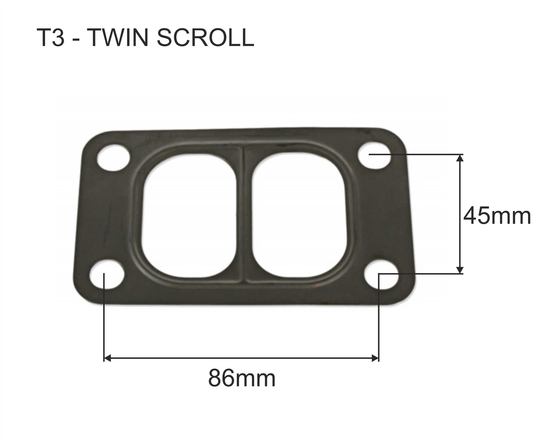 Uszczelka do turbosprężarek opartych na flanszy T3 Twin Scroll, np Garrett GT30, GT35, Holset HX35 . Wykonana ze stali nierdzewnej, posiada mocne przetłoczenie, dzięki czemu znakomicie uszczelnia łączenie kolektora wydechowego i turbiny, nie wypala się w przeciwieństwie do innych, tanich uszczelek.