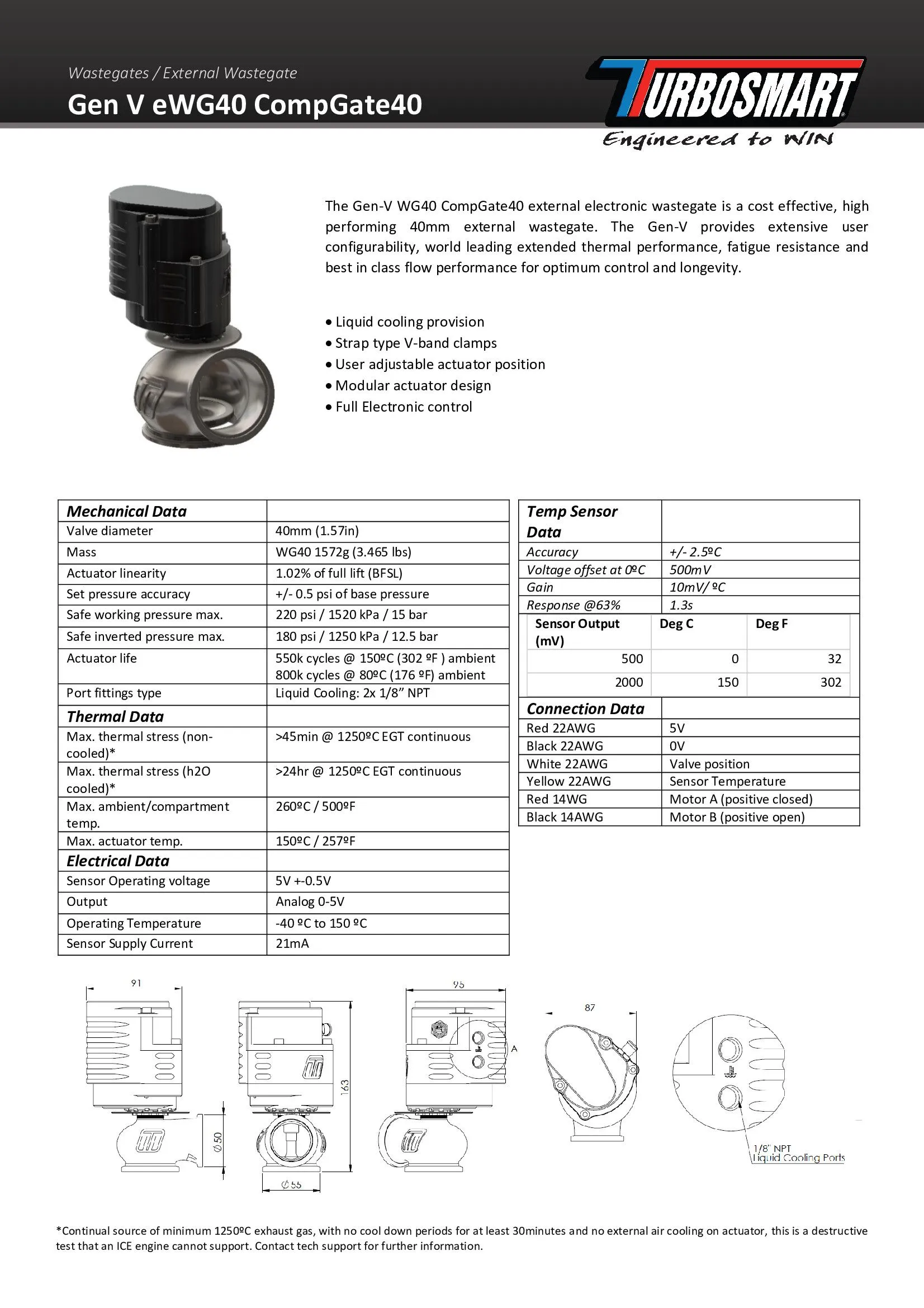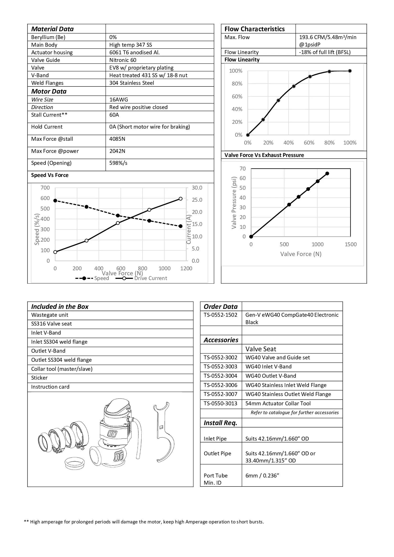 Oczekujący na patent Turbosmart eWG40 jest w pełni elektronicznie uruchamianym zaworem wastegate. Konstrukcja bazująca na udanej, wiodącej w swojej klasie architekturze GenV CompGate40, dodatkowo wyposażony w nowy system kontroli. Korpusu zaworu zapewnia bezproblemowy montaż, bezproblemowo pasuje do istniejącego kolektora i układu wylotowego. Zawory GenV CompGate40 już zapewniały wiodącą w swojej klasie wydajność przepływu i charakterystykę wymiany ciepła. Nowa generacja dodatkowo wyposażona jest w oczekujący na opatentowanie aktuator Turbosmart eWG, gwarantujący niezrównaną kontrolę. Brak sprężyn, przewodów i sygnału referencyjnego doładowania, a zatem wszelkie ograniczenia z nimi związane. Zniknęły "minimalne" poziomy doładowania związane z ciśnieniem sprężyny lub problemy związane z ciepłem przewodów. Możliwe jest ustawienie doładowanie w dowolnym zakresie, od zera do maksymalnej wartości - wszystko z użyciem laptopa lub interfejsu tuningowego. Cechy:- wiodący w swojej klasie, jakość potwierdzona badaniami CFD i testami wydajność przepływu- prowadnica zaworu Nitronic 40 i wysokotemperaturowy korpus ze stali 347- chłodzony cieczą, elektroniczny aktuator- obejmy typu V-band- regulowana przez użytkownika pozycja aktuatora- wbudowany analogowy czujnik położenia Wastegate 0-5V- wbudowany analogowy czujnik temperatury siłownika 0-5V Dostępne rozmiary: 40mm CompGate40 eWG 45mm HyperGate45 eWG 50mm ProGate50 eWG 60mm PowerGate60 eWG