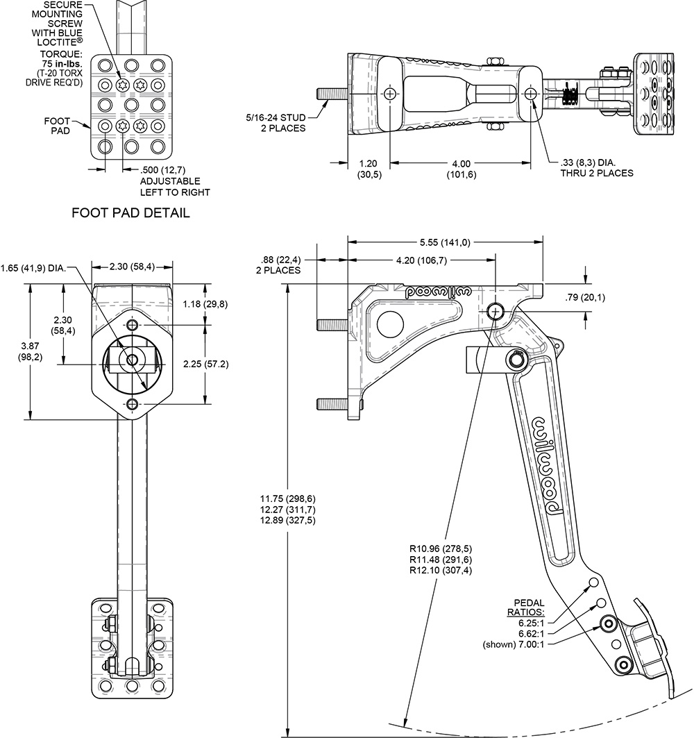Swing Mount Clutch / Brake Pedal-Adjustable Ratio Adjustable ratio single clutch pedal, in a forward swing hanging assembly. Pedal head adjusts vertically to provide a 6.25, 6.63, or 7.00:1 ratio for more feel or less pedal effort. The non-skid waffled pedal pad can be laterally adjusted 1/2 inch in either direction for driver preference. The pedals feature a lightweight aluminum frame, with high strength reinforced I-beam style forged pedal arms. A pin and clevis pushrod attachment system ensures the smallest possible misalignment angle for bind free operation through the entire range of travel. This pedal accepts Wilwood 2.25 inch vertical mount flange single outlet master cylinders, available separately in a variety of styles and bore sizes. Pedal Type Material Aluminum Finish Black E-coat Pedal Description Mount Loc Swing Mount Facing Forward Balance Bar No Mount Length (in) Pedal Ratio & Length Pedal 1 Ratio 6.25-7:1 Pedal 2 Ratio Pedal 1 Length (in) Pedal 2 Length (in)