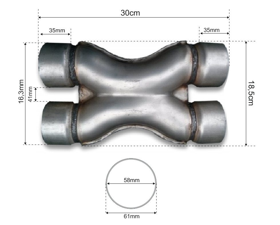 X-Pipe o średnicy wewnętrznej wlotów/wylotów 57mm, wykonany ze stali aluminiowanej (SS409), dzięki czemu zachowuje bardzo niską wagę. Niezbędny element w układzie wydechowym silników typu V, w kórych przyspiesza wylot spalin i wyrównuje ciśnienia pomiędzy rzędami cylindrów. Korzystnie wpływa na przyrost mocy i momentu obrotowego, dodatkowo wyciszając wydech, nadając mu ciekawego brzemienia.