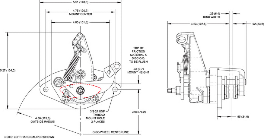 Zacisk hamulcowy MC5 Mechanical Wilwood MC5 Mechanical to wielozadaniowy zacisk hamulca postojowego sterowany linką, który łączy wysoką skuteczność działania z prostą i solidną konstrukcją. Jest to doskonałe rozwiązanie dla pojazdów wymagających oddzielnego, mechanicznie uruchamianego zacisku hamulca ręcznego. Model MC5 został zaprojektowany do współpracy z tarczami o grubości 0,25” oraz średnicy w zakresie od 11,00” do 12,88”. Korpus z odlewanego aluminium oraz kuty element oporowy typu billet zapewniają wysoką wytrzymałość pod obciążeniem, przy zachowaniu niewielkiej masy wynoszącej 3,3 lbs. Zacisk dostarczany jest z wysokotarciowymi klockami Composite Metallic (CM), wyposażonymi w osłony redukujące hałas. Zastosowane rozwiązania tłumiące drgania umożliwiają cichą pracę bez stuków i luzów. Zacisk przesuwny posiada stalowy wspornik ułatwiający montaż. Konstrukcja przewiduje górne mocowanie linki, a mechanizm dźwigni można ustawić w trzech pozycjach dla optymalnego prowadzenia przewodu. Aluminiowy tłok o średnicy 1,25” jest w pełni zabezpieczony osłoną przeciwpyłową, chroniąc przed wilgocią i zabrudzeniami. Ręczny mechanizm regulacji nie wymaga specjalnych narzędzi i pozwala kompensować zużycie tarczy oraz klocków. Zacisk dostępny jest z wykończeniem anodowanym typu III. Tłoki Liczba tłoków: 1 Powierzchnia tłoka: 1,19 in² Typ tłoka: aluminium Osłona przeciwpyłowa: tak Wymiary tarczy Szerokość tarczy: 0,25” Średnica tarczy: 12,88” Wymiary klocków Powierzchnia klocków: 1,7 in² Objętość klocków: 0,26 in³ Klasa pracy i materiał Materiał: odlewane aluminium Masa: 3,3 lbs Kolory i wykończenie Kolor: anodowany Wykończenie: anodowanie typu III Montaż Rozstaw mocowania: 4,75” Strona montażu: lewa Typ mocowania: pływający Specyfikacja Kompatybilność tarcz Szerokość tarczy: 0,25” Maksymalna szerokość tarczy: 0,25” Minimalna szerokość tarczy: 0,15” Maksymalna średnica tarczy: 12,88” Minimalna średnica tarczy: 11,00” Specyfikacja klocków hamulcowych Typ klocków 1: 6407 Typ klocków 2: N-A Typ klocków 3: N-A Całkowita powierzchnia klocków: 1,7 in² Całkowita objętość klocków: 0,26 in³ Specyfikacja tłoka Średnica tłoka 1: 1,25” Całkowita powierzchnia tłoków: 1,19 in² Dane montażowe Typ mocowania: pływający Strona montażu: lewa Rozstaw mocowania: 4,75” Średnica otworu mocującego: 0,67” Gwint przyłącza: N-A