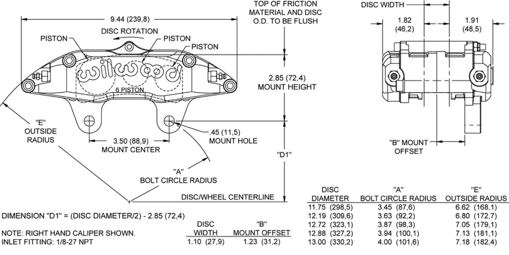 Zacisk hamulcowy Billet Narrow Superlite SL6, mocowanie 6-śrubowe Druga generacja serii Narrow SL6 została zaprojektowana z wykorzystaniem najnowszych technologii Wilwood. Wysokowytrzymałe korpusy typu Billet z wewnętrznymi kanałami wyrównawczymi umożliwiają montaż zacisku zarówno przed, jak i za zwrotnicą przy zastosowaniu tego samego numeru katalogowego. Zachowano identyczny, centryczny rozstaw mocowania 3,50", charakterystyczny dla oryginalnego zacisku Narrow Superlite. Każdy zacisk jest precyzyjnie obrabiany CNC z kutego aluminium Billet o wysokiej wytrzymałości. Zmieniony profil zewnętrzny poprawia prześwit względem felgi oraz estetykę zespołu hamulcowego. Zaciski dostępne są w czarnym i czerwonym lakierze proszkowym oraz w wersji polerowanej o jakości pokazowej. Wyjątkowa skuteczność modelu BNSL6 wynika z niezwykle trwałej, wydajnej i lekkiej konstrukcji korpusu. Masa od 5,2 lb jest efektem komputerowego modelowania bryłowego oraz analizy naprężeń metodą MES (FEA). Pełnej długości żebra usztywniające oraz wzmocnione przejścia promieniowe pomiędzy gniazdami tłoków a zamkniętymi mostkami końcowymi tworzą najsztywniejsze korpusy zacisków Superlite, jakie dotychczas wyprodukowano. W porównaniu z konstrukcjami z otwartym mostkiem, wykorzystującymi tuleje dystansowe, zamknięta konstrukcja mostka zapewnia znacznie mniejsze ugięcie i rozwarcie pod obciążeniem. Dodatkową sztywność gwarantują cztery stalowe śruby mostka oraz piąta, centralna śruba, umożliwiająca łatwy dostęp do klocków bez konieczności demontażu zacisku z mocowania. Unikalna sześciotłoczkowa konfiguracja o zróżnicowanych średnicach zapewnia równomierne rozłożenie sił, co przekłada się na jednolite zużycie klocków w warunkach długotrwałej pracy w wysokich temperaturach. Standardowe zaciski SL6 wyposażone są w jednoczęściowe tłoki ze stali nierdzewnej, charakteryzujące się niskim przewodnictwem cieplnym oraz wysoką odpornością na korozję. Każdy zacisk posiada płyty mostkowe SRS, które eliminują zużycie mostka spowodowane pracą klocków i wydłużają żywotność zacisku. Sprężynujące działanie płyt SRS redukuje drgania klocków oraz tłumi wibracje harmoniczne odpowiedzialne za piszczenie hamulców. Dwuczęściowe odpowietrzniki są zagłębione w korpusie, co chroni je przed zanieczyszczeniami torowymi i uszkodzeniami mechanicznymi. Wysokotemperaturowe uszczelnienia tłoków o kwadratowym przekroju zapewniają maksymalną powierzchnię uszczelnienia oraz kontrolowany cof tłoków po zwolnieniu hamulca. Dostępna jest pełna gama mieszanek klocków Wilwood, umożliwiająca precyzyjne dopasowanie charakterystyki hamowania do zastosowań sportowych i wyścigowych. Tłoki Liczba tłoków: 6 Powierzchnia tłoków: 4,04 in² Typ tłoków: stal nierdzewna Osłona przeciwpyłowa: brak Wymiary tarczy Szerokość tarczy: 1,10 in Średnica tarczy: 14,00 in Wymiary klocków Powierzchnia klocków: 8,2 in² Objętość klocków: 3,8 in³ Klasa obciążenia i materiał Materiał: aluminium Billet Masa: 5,2 lb Kolory i wykończenie Kolor: czerwony Wykończenie: czerwony lakier proszkowy Mocowanie Rozstaw mocowania: 3,50 in Strona montażu: prawa Typ mocowania: lug Specyfikacja Kompatybilność tarcz Szerokość tarczy: 1,10 in Maksymalna szerokość tarczy: 1,10 in Minimalna szerokość tarczy: 1,00 in Maksymalna średnica tarczy: 14,00 in Minimalna średnica tarczy: 11,75 in Specyfikacja klocków hamulcowych Typ klocka 1: 7416 Typ klocka 2: N/A Typ klocka 3: N/A Całkowita powierzchnia klocków: 8,2 in² Całkowita objętość klocków: 3,8 in³ Specyfikacja tłoków Średnica tłoka 1: 1,62 in Średnica tłoka 2: 1,12 in Średnica tłoka 3: 1,12 in Całkowita powierzchnia tłoków: 4,04 in² Specyfikacja montażowa Typ mocowania: lug Strona montażu: prawa Rozstaw mocowania: 3,50 in Średnica otworu montażowego: 0,45 in Wysokość mocowania: 2,85 in Gwint przyłącza: 1/8-27 NPT