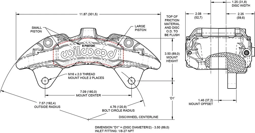 Zacisk hamulcowy AeroDM z mocowaniem Lug Nowy, kuty sześciotłoczkowy zacisk hamulcowy AeroDM zapewnia wysoką siłę hamowania w zastosowaniach drogowych oraz terenowych. Konstrukcja łączy technologie wyścigowe z korpusem o szerokich możliwościach adaptacji. Dzięki zmiennej geometrii mocowania typu Lug, AeroDM umożliwia bezpośredni montaż do zwrotnicy w połączeniu z dedykowanymi tarczami o średnicy 13,38” w wielu nowoczesnych pojazdach typu truck. Różne warianty objętości tłoczków zapewniają wszechstronność niezbędną do obsługi ciężkich układów hamulcowych. Model AeroDM jest najnowszym rozwinięciem serii zacisków Aero4/6. Zastosowano w nim wewnętrzne kanały przepływu płynu hamulcowego, eliminujące zewnętrzne rurki przelewowe, oraz masywny centralny mostek zwiększający sztywność konstrukcji. Korpus serii Aero wykonywany jest w procesie kucia stress-flow z wysokogatunkowego stopu aluminium. Technologia ta powoduje ukierunkowanie struktury ziaren metalu zgodnie z kształtem zacisku, eliminując naprężenia i przerwania struktury charakterystyczne dla obróbki z litego bloku. Rezultatem jest zacisk o bardzo wysokiej efektywności docisku oraz wyjątkowej odporności na zmęczenie, naprężenia i odkształcenia pod obciążeniem. Tłoczki Liczba tłoczków: 6 Całkowita powierzchnia tłoczków (in²): 6,52 Typ tłoczków: stal nierdzewna Osłona przeciwpyłowa: brak Wymiary tarczy Szerokość tarczy (in): 1,25 Średnica tarczy (in): 13,38 Wymiary klocków Powierzchnia klocków (in²): 11,1 Objętość klocków (in³): 5,2 Klasa zastosowania i materiał Materiał: kute aluminium Masa (lbs): 8,9 Kolory i wykończenie Kolor: czerwony Wykończenie: czerwona powłoka proszkowa Mocowanie Rozstaw mocowania (in): 7,09 Strona montażu: lewa Typ mocowania: Lug Specyfikacja Kompatybilność tarcz Nominalna szerokość tarczy (in): 1,25 Maksymalna szerokość tarczy (in): 1,28 Minimalna szerokość tarczy (in): 1,10 Maksymalna średnica tarczy (in): 13,38 Minimalna średnica tarczy (in): 12,19 Specyfikacja klocków hamulcowych Typ klocków 1: 6617 Typ klocków 2: N-A Typ klocków 3: N-A Całkowita powierzchnia klocków (in²): 11,1 Całkowita objętość klocków (in³): 5,2 Specyfikacja tłoczków Średnica tłoczka 1 (in): 1,75 Średnica tłoczka 2 (in): 1,62 Średnica tłoczka 3 (in): 1,62 Całkowita powierzchnia tłoczków (in²): 6,52 Specyfikacja montażowa Typ mocowania: Lug Strona montażu: lewa Rozstaw mocowania (in): 7,09 Średnica otworów montażowych (in): 0,63 Gwint przyłącza hydraulicznego: 1/8-27 NPT