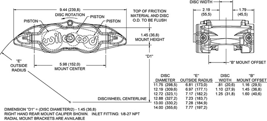 Kuty Wąski Superlite 6 Radial Mount z Tłokami Thermlock Kuty Wąski Superlite 6R/ST (FNSL6R/ST) to najnowsza wersja uznanej serii zacisków Superlite, rozszerzona o wszechstronność i wygodę wynikającą z zastosowania mocowania promieniowego. Montaż radialny upraszcza adaptację oraz zapewnia dwie płaszczyzny regulacji, umożliwiające precyzyjne ustawienie zacisku względem tarczy hamulcowej. Zaciski wykorzystują najnowsze technologie Wilwood oraz izolowane tłoki Thermlock, zapewniając wysoką skuteczność hamowania w ekstremalnie wysokich temperaturach, zarówno w zastosowaniach drogowych, jak i wyścigowych. Wyjątkowa skuteczność serii FNSL6R wynika z bardzo trwałej i efektywnej konstrukcji korpusu. Masa zacisku zaczyna się od 4,9 funta i jest rezultatem komputerowego modelowania bryłowego oraz analizy naprężeń metodą FEA. Korpusy powstają w procesie kucia stress-flow z wysokogatunkowych kęsów stopu aluminium, co zapewnia optymalne ukierunkowanie struktury ziaren metalu zgodnie z konturem zacisku oraz eliminuje wewnętrzne naprężenia typowe dla obróbki z litego bloku. Sześciotłoczkowa konfiguracja o zróżnicowanych średnicach cylindrów zapewnia zrównoważone obciążenie i równomierne zużycie klocków podczas długotrwałej pracy w wysokich temperaturach. Zaciski FNSL6R/ST wyposażone są w ekskluzywne tłoki Thermlock firmy Wilwood. Ich wieloczęściowa konstrukcja tworzy bardzo skuteczną barierę termiczną, ograniczając transfer ciepła do korpusu zacisku, uszczelnień i płynu hamulcowego, co przekłada się na dłuższą żywotność komponentów i mniejsze ryzyko zaniku siły hamowania. Tłoki Liczba tłoków: 6 Całkowita powierzchnia tłoków: 4,04 in² Typ tłoków: Thermlock Osłona przeciwpyłowa: brak Wymiary tarczy Szerokość tarczy: 0,38 in Średnica tarczy: 14,00 in Wymiary klocków Powierzchnia klocka: 8,2 in² Objętość klocka: 3,8 in³ Klasa obciążenia i materiał Materiał: kuty aluminium Masa: 5,0 lb Kolory i wykończenie Kolor: anodowany Wykończenie: anodowanie typu III Mocowanie Typ mocowania: promieniowe Strona montażu: prawa Rozstaw montażowy: 5,98 in Zgodność z tarczami Minimalna szerokość tarczy: 0,32 in Maksymalna szerokość tarczy: 0,38 in Minimalna średnica tarczy: 11,75 in Maksymalna średnica tarczy: 14,00 in Specyfikacja klocków hamulcowych Typ klocka 1: 7416 Typ klocka 2: N-A Typ klocka 3: N-A Całkowita powierzchnia klocków: 8,2 in² Całkowita objętość klocków: 3,8 in³ Specyfikacja tłoków Średnica tłoka 1: 1,62 in Średnica tłoka 2: 1,12 in Średnica tłoka 3: 1,12 in Całkowita powierzchnia tłoków: 4,04 in² Specyfikacja montażowa Typ mocowania: promieniowe Strona montażu: prawa Rozstaw montażowy: 5,98 in Średnica otworu montażowego: 0,39 in Wysokość montażowa: 1,45 in Gwint przyłącza hydraulicznego: 1/8-27 NPT