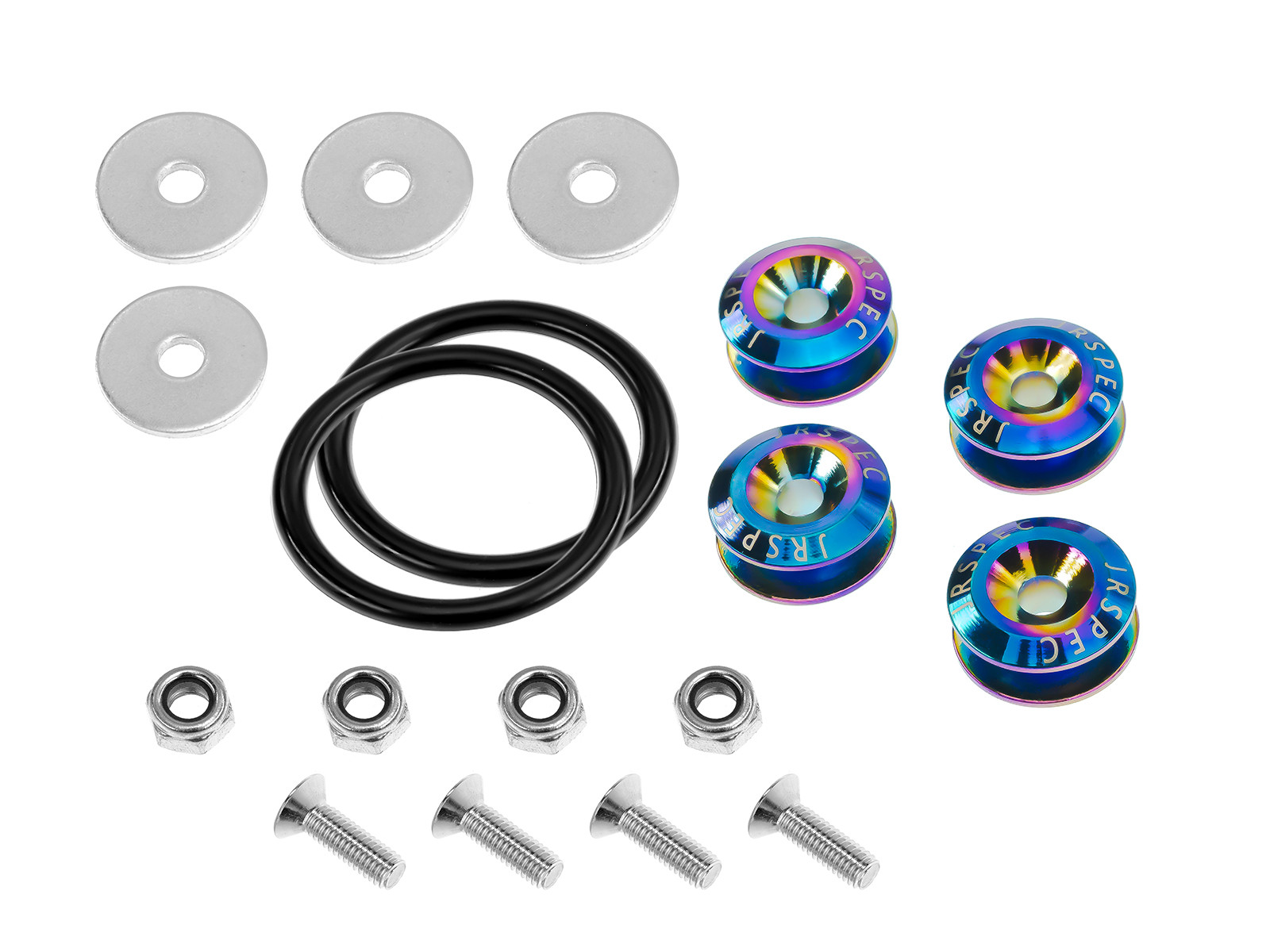 Uniwersalne zapinki marki JRspec wykonane z aluminium o średnicy 24mm. Umożliwiają szybki montaż i demontaż np. zderzaka poprzez połączenie dwóch aluminiowych adapterów gumką. Mogą być zastosowane do maski, klapy, zderzaka, itp. W komplecie 4 zapinki, 2 gumki, śruby wraz z nakrętkami i podkładkami. Solidna konstrukcja zapewnia bezpieczeństwo i wygodę użytkowania. Przeznaczone są do motorsportu, na obiektach zamkniętych.