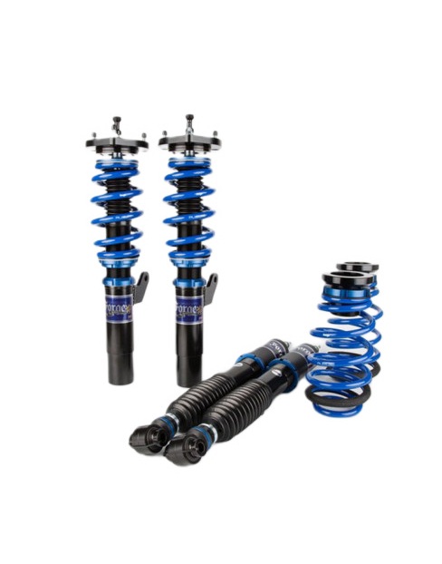 Zawieszenie Forge Motorsport, opracowane i przetestowane we współpracy ze specjalistą od pojazdów elektrycznych Cleevely EV, oferuje idealny kompromis pomiędzy sportowymi osiągami a codziennym komfortem jazdy. Dzięki 32-stopniowej regulacji tłumienia, zestaw można precyzyjnie dopasować do indywidualnych preferencji — zarówno do jazdy torowej, jak i drogowej. Regulacja obejmuje jednocześnie tłumienie dobicia i odbicia, co zapewnia pełną kontrolę nad charakterystyką zawieszenia. Przednie amortyzatory wyposażone są w górne mocowania z łożyskami kulkowymi, umożliwiające regulację kąta pochylenia kół (camber). Najważniejsze cechy zestawu: konstrukcja z bezszwowych rur stalowych o średnicy 52 mm (zgodność z normami JIS G3445 oraz DIN2393) tłok wewnętrzny o średnicy 44 mm z liniową charakterystyką pracy dla optymalnego tłumienia wysokiej klasy amortyzatory typu single-tube (monotube) specjalny olej o wysokiej lepkości gwarantujący skuteczne i stabilne tłumienie regulowana długość amortyzatora, eliminująca konieczność zmiany napięcia sprężyny jak w standardowych coiloverach sprężyny formowane na zimno z wytrzymałej stali (zgodne z SAE9252) Zestaw obniża pojazd o około 30 mm, poprawiając prowadzenie oraz wygląd auta. Zastosowanie: Tesla Model 3 (od 2018+) Tesla Model Y (od 2021+)