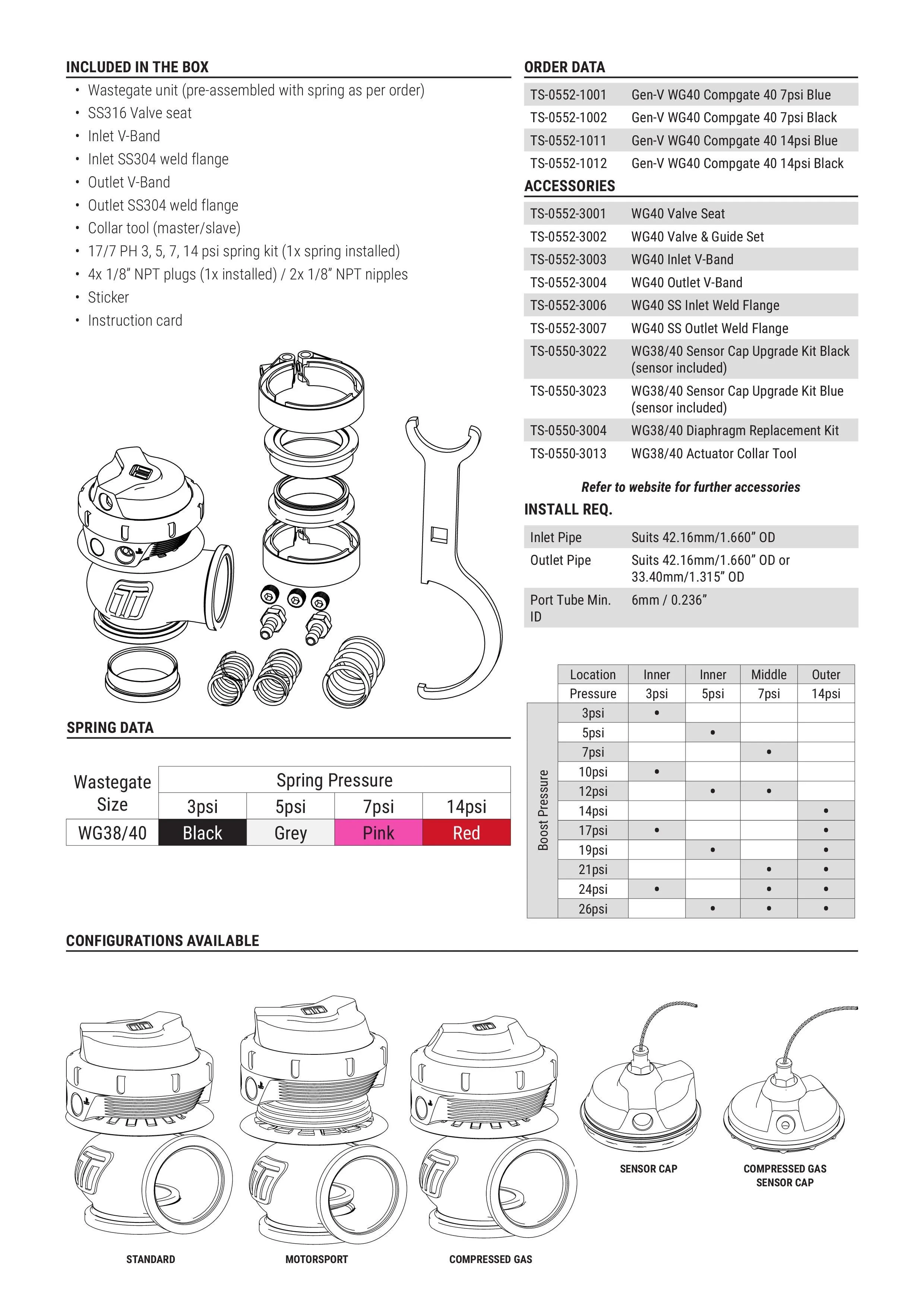 Gen-V WG40 Comp-Gate40 to wysokowydajny zewnętrzny zawór wastegate 40 mm.  Zawór Gen-V umożliwia szeroki zakres konfiguracji przez użytkownika, zapewnia najlepszą charakterystykę cieplną i najlepsze w swojej klasie parametry przepływu dla optymalnej regulacji oraz długowieczności.  Gwarantuje kompatybilność ze wszystkimi zaworami wastegate Turbosmart IV generacji, wyposażony jest również w unikalny system blokady kołnierza, zmienną pokrywę i podstawę aktuatora, zaciski V-band, chłodzenie cieczą, porty 1/8″ NPT i jest dostarczany z zestawem sprężyn.  Zawór dostępny w wersji motorsport oraz w wersji na sprężony gaz  Cechy produktu: - bezpośredni zamiennik dla Turbosmart Gen 4 Comp-Gate 40, wlot jest taki sam jak w innych zaworach V-band 38/40mm.  - zawór 40mm - gniazda z gwintem 1/8" NPT - system mocowania V-band na rurę 1-3/4" (średnica zewnętrzna) - dostępne w wersjach motorsport i ze sprężonym gazem W zestawie: - flansza mocująca ze stali nierdzewnej 316  - wlot - flansza ze stali nierdzewnej 304 z obejmą V-band   - wylot - flansza ze stali nierdzewnej 304 z obejmą V-band  - narzędzie do montażu (collar tool) - zestaw sprężyn 3, 5, 7, 14 psi (jedna sprężyna zamontowana)  - 4 zaślepki 1/8" NPT (jedna zaistalowana) oraz dwa króćce przyłączeniowe  1/8" NPT  - naklejka i instrukcja