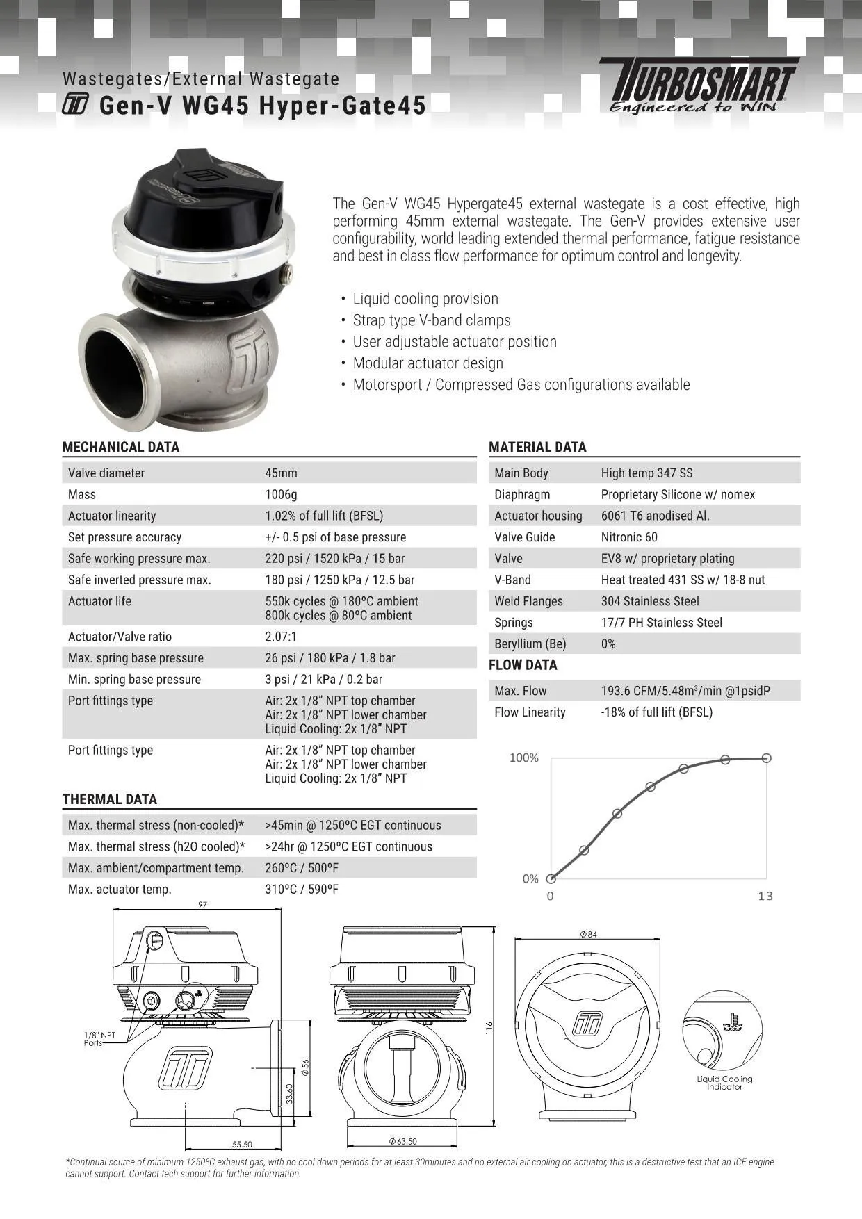 The GenV WG45 HyperGate45 External Wastegate is a Motorsport-proven, cost-effective 45mm external wastegate – The highest flowing gate of its kind. The GenV provides extensive user configuration, world-leading extended thermal performance, fatigue resistance and best-in-class flow performance for optimum control and longevity. The GenV External Wastegate from Turbosmart was a ground-up rework of a classic, and the only feature that rolled over from the Gen4 range was the mounting orientation. CFD optimized and validated in-house for maximum flow and thermal management; the GenV Range has more features, options and performance than any other gate. A direct fit upgrade to all Gen4 Turbosmart wastegates and feature our unique collar-locking system, variable actuator cap and base for easy, 360-degree optional routing of reference hoses, strap-type Vband clamps, optional liquid-cooling provision, 1/8″ NPT reference ports and are provided with the full range of available springs. Available InBlack, Blue, Red, Purple and Sleeper coloursWastegate Position Sensor Optional UpgradeCompressed Gas / Co2 VersionMotorsport / Extreme Temp VersionElectronically Actuated / eWG VersionHigh Pressure (Up to 50psi Base) Version FeaturesClass Leading Thermal Performance Class Leading CFD & Bench Validated Flow PerformanceClass Leading Fatigue ResistanceOptional Liquid Actuator CoolingOptional Position Sensor Available SeparatelyRotatable / Clockable Actuator HousingNitronic 60 Valve Guide & High Temp 347 SS Body17-7 PH Stainless Steel SpringsStrap Type V-band clamps