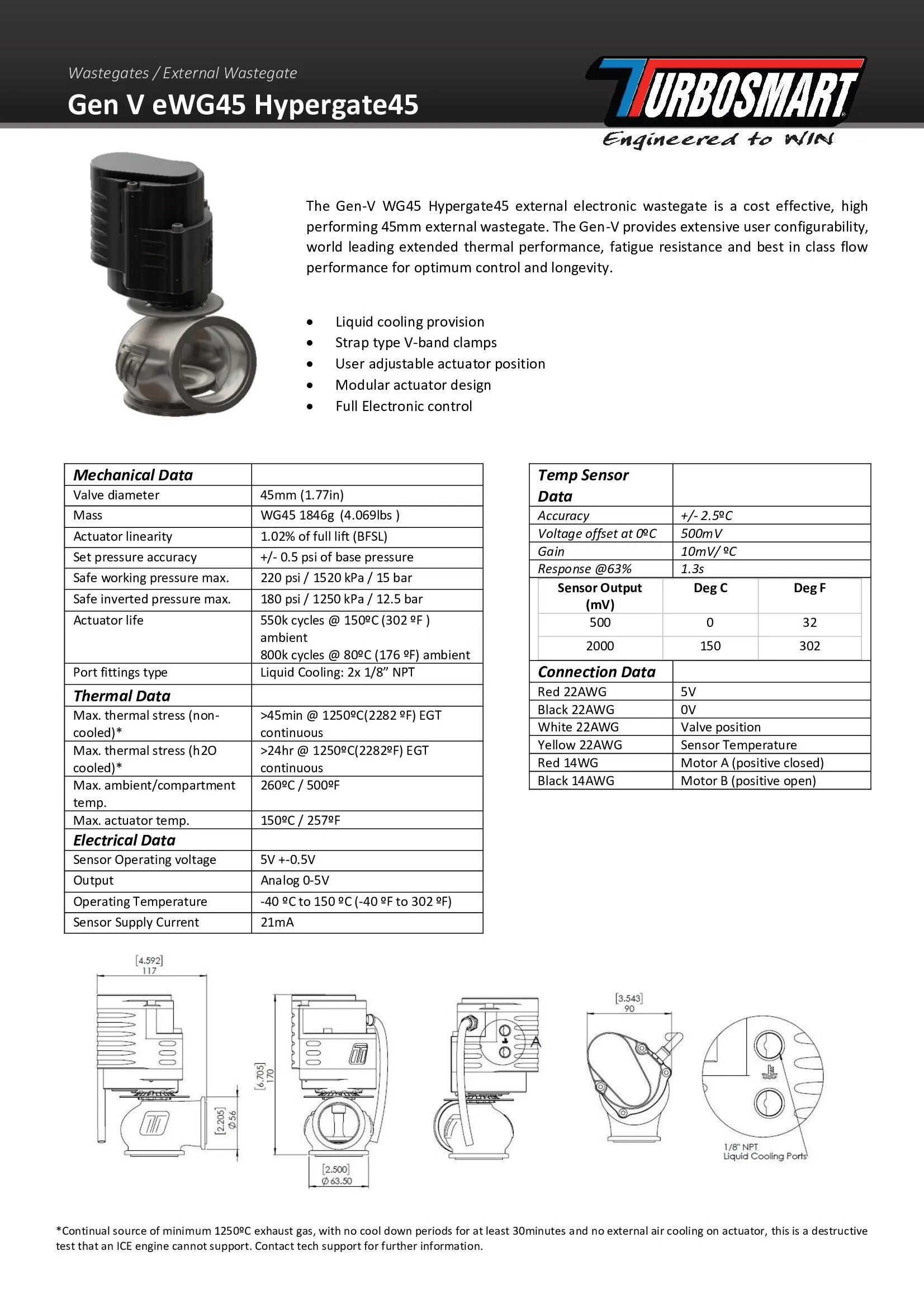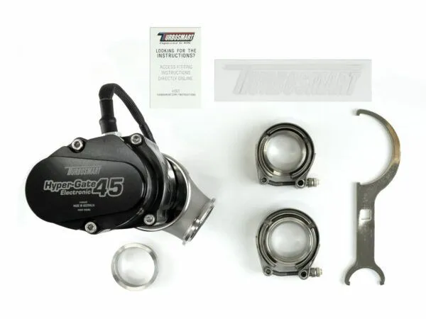 Turbosmart’s Patent Pending, eWG45 is a fully electronic actuated 45mm wastegate – Built on the successful, class-leading GenV HyperGate45 architecture, now with the kind of control never seen before. The eWG45 HyperGate45 is a 45mm Electronic External Wastegate which uses full electronic control withou the limitations associated with traditional penumatic control. Starting with a Turbosmart’s GenV wastegate body, you can be confident the mounting orientation will match your existing manifold & outlet hardware. The GenV Hypergate45 already had class-leading flow capacity & heat handling characteristics. Now featuring the Turbosmart Patent Pending eWG actuator system, you can also be sure of unparalleled control. There are no springs, hoses, boost reference signals or associated limitations. Gone are ‘Minimum’ boost levels associated with base spring pressure or heat-related issues with hoses. If your manifold priority is good enough, you can set your boost anywhere from zero to ‘All of it’ – All from your laptop or tuning interface. The eGate range requires a Dual Half-Bridge input for control, much like how an electronic throttle body is controlled and the strategy is as good as your imagination & your ECU or controller will allow. Don’t have an ECU that has a spare Dual Half-Bridge Output? No problem at all, checkout the Turbosmart BlackBox Electronic Wastegate Controller with up to 2 independant channels via simple PWM inputs, or more advanced CAN based inputs – All onboard & in the one unit! Available in40mm CompGate40 eWG – TS-0552-150245mm HyperGate45 eWG –TS-0553-150250mm ProGate50 eWG – TS-0554-150260mm PowerGate60 eWG –TS-0555-1502StraightGate50 eWG – TS-0565-1002 FeaturesClass Leading, CFD & Bench Validated Flow PerformanceNitronic 60 Valve Guide & High Temp 347 SS BodyLiquid Cooled, Electronic ActuatorStrap Type V-band clampsUser Adjustable Actuator PositionOnboard Analog 0-5V Wastegate Position SensorOnboard Analog 0-5V Actuator Temperature SensorOnboard Digital (PWM) Wastegate Position Sensor