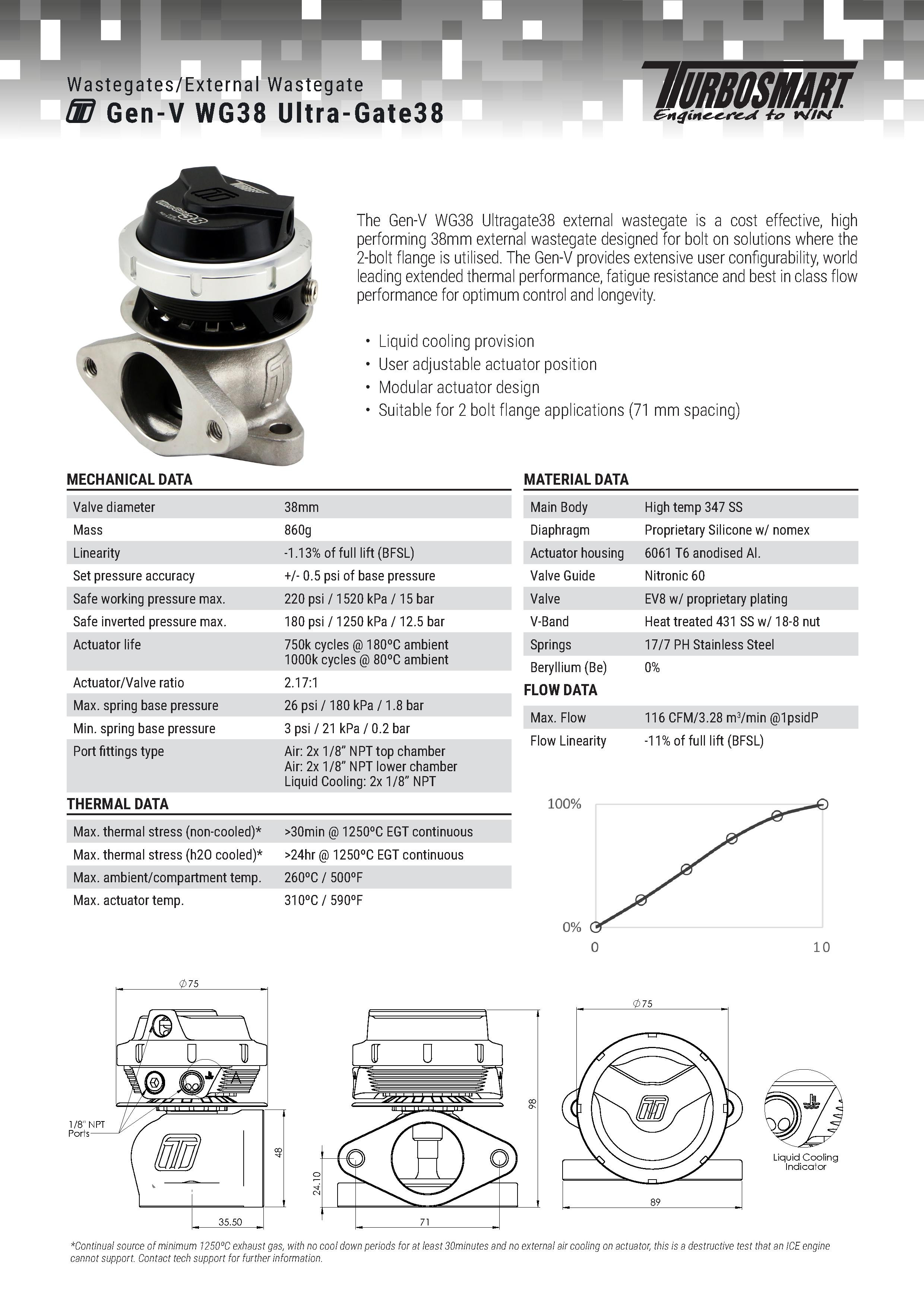 Zewnętrzny zawór wastegate GenV WG38 UltraGate38 jest sprawdzonym w sportach motorowych, ekonomicznym zewnętrznym zaworem wastegate - największym w gamie Turbosmart GenV i o najwyższym przepływie na świecie. Gen-V zapewnia szeroki zakres konfiguracji, wiodącą na świecie zwiększoną wydajność termiczną, odporność zmęczeniową i najlepszą w klasie wydajność przepływu dla optymalnej kontroli i długowieczności.