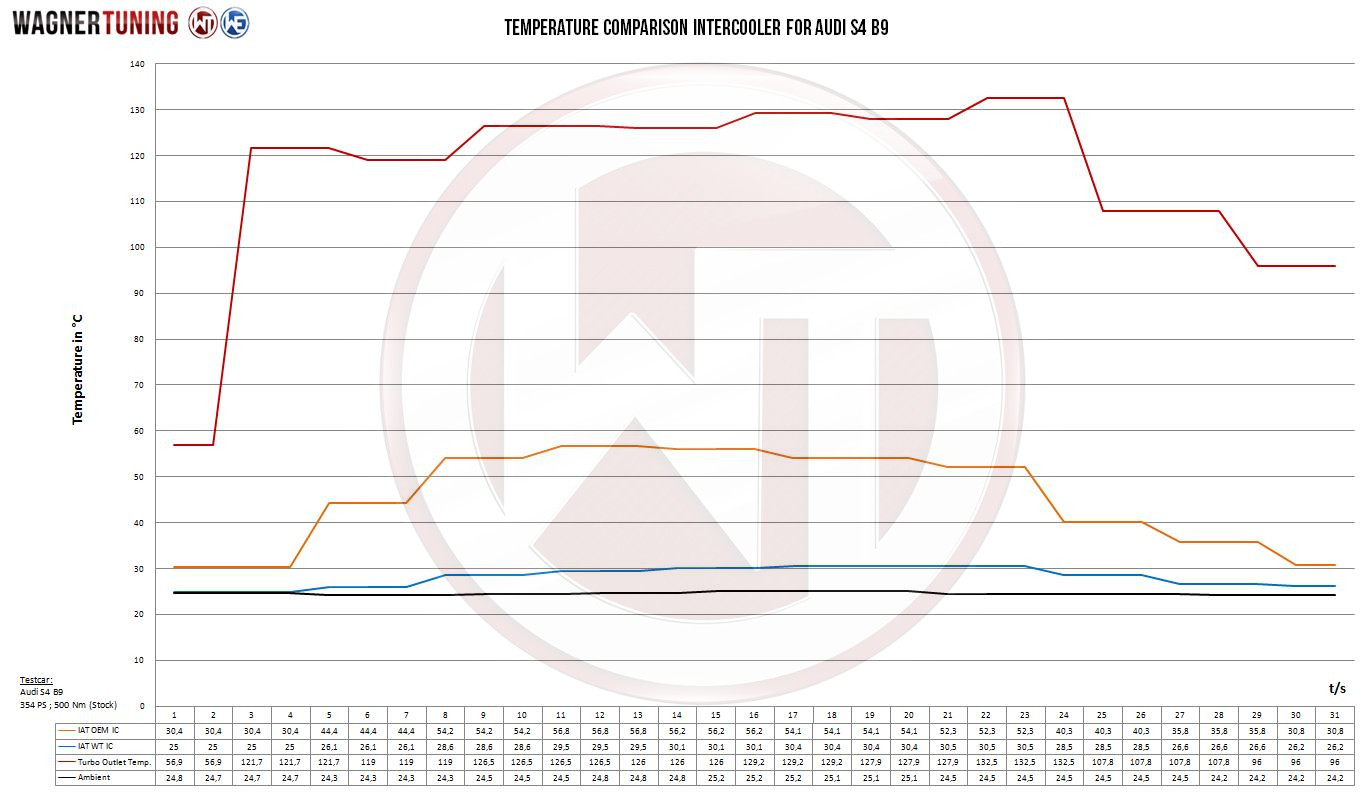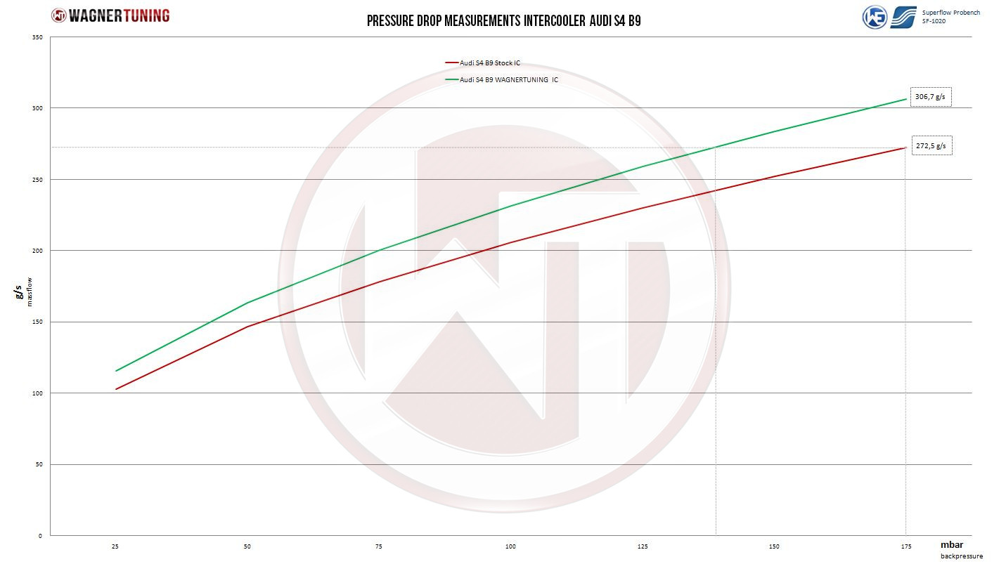 Inżynierowie Wagner Tuning zwiększyli rozmiar i wydajność rdzenia intercoolera, a także ulepszyli konstrukcję boczków, aby usunąć wszelkie wąskie gardła OEM, co skutkuje zwiększonym natężeniem przepływu i poprawą chłodzenia przepływającego powietrza.