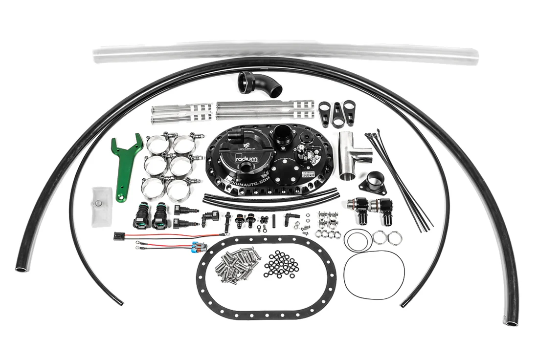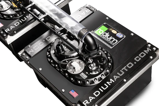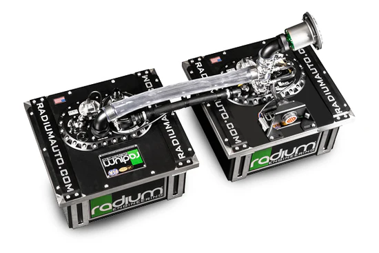 Ten innowacyjny system transferu paliwa umożliwia zastosowanie dwóch sportowych zbiorników paliwa (fuel cell) w jednym pojeździe, optymalizując całkowitą pojemność paliwa oraz rozkład masy. Zbiorniki mogą być montowane w sposób strategiczny, co pozwala uzyskać optymalny balans pojazdu oraz niski środek ciężkości. Wymagane komponenty Dwa zbiorniki paliwa Radium Engineering Fuel Cell Możliwe jest zastosowanie zbiorników o różnych pojemnościach, jednak górne kołnierze obu zbiorników muszą znajdować się na tej samej wysokości. Zbiornik wyrównawczy Radium Engineering FCST-X Poprzednia wersja FCST (bez oznaczenia X) nie jest kompatybilna z tym systemem, ponieważ nie posiada dostępu do pompy podnoszącej (uchwyt FCST-X). Minimum 3 pompy paliwa 2 pompy podnoszące (lift pumps) 1–3 pompy w zbiorniku wyrównawczym Pompy podnoszące muszą posiadać wbudowane zawory zwrotne na wyjściu. Pompy bez zaworów mogą powodować cofanie paliwa i awarie systemu. Zdalny wlew paliwa i zestaw odpowietrzania lub zestaw zdalnego tankowania Dzięki zastosowaniu przewodów o średnicy wewnętrznej 1,5", możliwe jest użycie dowolnego zdalnego wlewu paliwa z króćcem 1,5" OD. System jest kompatybilny zarówno ze standardowymi, jak i wyczynowymi (dry break) systemami tankowania. Zalecane komponenty Jeden lub dwa czujniki poziomu paliwa Radium Engineering Przy zastosowaniu jednego czujnika zaleca się montaż w aktywnym zbiorniku paliwa. Zalecanym rozwiązaniem jest jednak użycie dwóch czujników. Uwaga: połączenie dwóch czujników 0–90 Ω w szereg tworzy nowy zakres 0–180 Ω Przy podłączeniu do programowalnego ECU możliwe jest sterowanie pompą podnoszącą strony pasywnej w celu jej wyłączenia po opróżnieniu zbiornika. Przełącznik poziomu paliwa Radium Engineering 20-0461 Montowany w porcie 1/8” NPT w dolnej płycie zbiornika wyrównawczego. Może sterować przekaźnikiem lub służyć jako wejście ECU do kontroli pompy podnoszącej strony aktywnej. Przy pełnym zbiorniku wyrównawczym pompa może zostać wyłączona. Uwagi techniczne Zawór przeciwwywrotny (rollover valve) w FCST-X jest usuwany, a port odpowietrzający pełni funkcję przelewu powietrza i paliwa do zbiornika pasywnego. Złączka odpowietrzająca zostaje przeniesiona z FCST-X do nowego portu odpowietrzania w zbiorniku pasywnym. Ze względu na nową lokalizację odpowietrzenia, zbiornik aktywny musi napełniać się tuż przed zbiornikiem pasywnym. Orientacja trójnika T ze stali nierdzewnej 1,5" OD (pionowa lub pozioma) decyduje o kolejności napełniania zbiorników, zgodnie z zasadami dynamiki przepływu. System umożliwia montaż zbiorników poprzecznie lub wzdłużnie – zestaw zawiera przewody i złączki dla obu konfiguracji. Wymagane jest indywidualne sterowanie pompą podnoszącą zbiornika pasywnego na podstawie sygnału z czujnika poziomu paliwa. Pompa podnosząca zbiornika aktywnego może być sterowana przełącznikiem poziomu paliwa i włącza się automatycznie przy spadku poziomu paliwa w zbiorniku wyrównawczym.