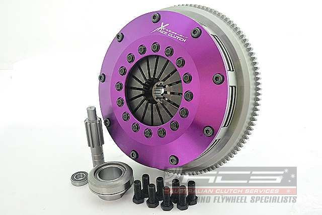 -2B Sprzęgło wyścigowe Xtreme 200mm zostało opracowane z myślą o osobach szukających ekonomicznej alternatywy wobec innych zestawów typu race dostępnych na rynku, bez kompromisów w zakresie jakości. Zestaw 200mm Race Clutch Kit składa się z koła zamachowego Billet, sprężynowanych ceramicznych tarcz sprzęgła, zespołu docisku, łożyska oporowego i prowadnicy / lub wewnętrznego koncentrycznego wysprzęglika (CSC). Siła docisku 1000kg Moment obrotowy (rating) 1200Nm Średnica styku łożyska 44-52mm Obciążenie łożyska (@ 48mm) 218kg Wymagany skok wysprzęglania 6mm Masa zespołu (bez koła zamachowego) 7.4kg Masa statyczna kompletu tarcz 2.15kg Grubość okładziny – nowa 7mm (0.275") Grubość okładziny – zużyta 6.48mm (0.255") Funkcje produktu: Sprężynowane tarcze o wysokim przenoszonym momencie (wspólny piast) Docisk typu push z pokrywą billet z lekkiego stopu Płyty dociskowa i pośrednia z 4140 Chromoly Utwardzane stalowe słupki oporowe Niska bezwładność Elementy serwisowalne Projekt z certyfikacją SFI