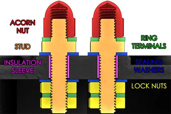 Te hermetycznie zamknięte szpilki grodziowe doskonale nadają się do przepuszczania dużych prądów przez ścianę lub panel. Wszystko, co jest wymagane, to wywiercony otwór. Zestaw zawiera 6 szpilek. Każda jest wykonany na zamówienie metodą CNC ze stali nierdzewnej 304. W zestawie znajduje się specjalna tuleja izolacyjna zapobiegająca przewodzeniu przez panel i korozji galwanicznej. Każdy zacisk pierścieniowy akceptuje przewód 10-12 AWG. Nakrętka z anodyzowanego aluminium i koszulka termokurczliwa izolują odsłonięte obszary przed przypadkowymi zwarciami. Każda szpilka zawiera 2 górne nakrętki blokujące zapewniające niezawodne połączenie. Zestaw jest kompatybilny ze wszystkimi rodzajami paliwa, w tym benzyną, olejem napędowym, etanolem, metanolem, E85 itp. W zestawie znajdują się szpilki, specjalne nakrętki, zaciski pierścieniowe, nylonowe nakrętki, podkładki i koszulki termokurczliwe. Poniższe wymagania wymiarowe są wymagane do prawidłowego użytkowania: Średnica wywierconego otworu: 0,220"-0,234" (5,5 mm - 6 mm) (wiertło 15/64" - 6 mm) Grubość materiału: 0,262" - 0,322" (6.6mm - 8.17mm) Uwagi: -Pomyślnie przetestowane do 30A. -Zestaw zawiera 6 zestawów szpilek.